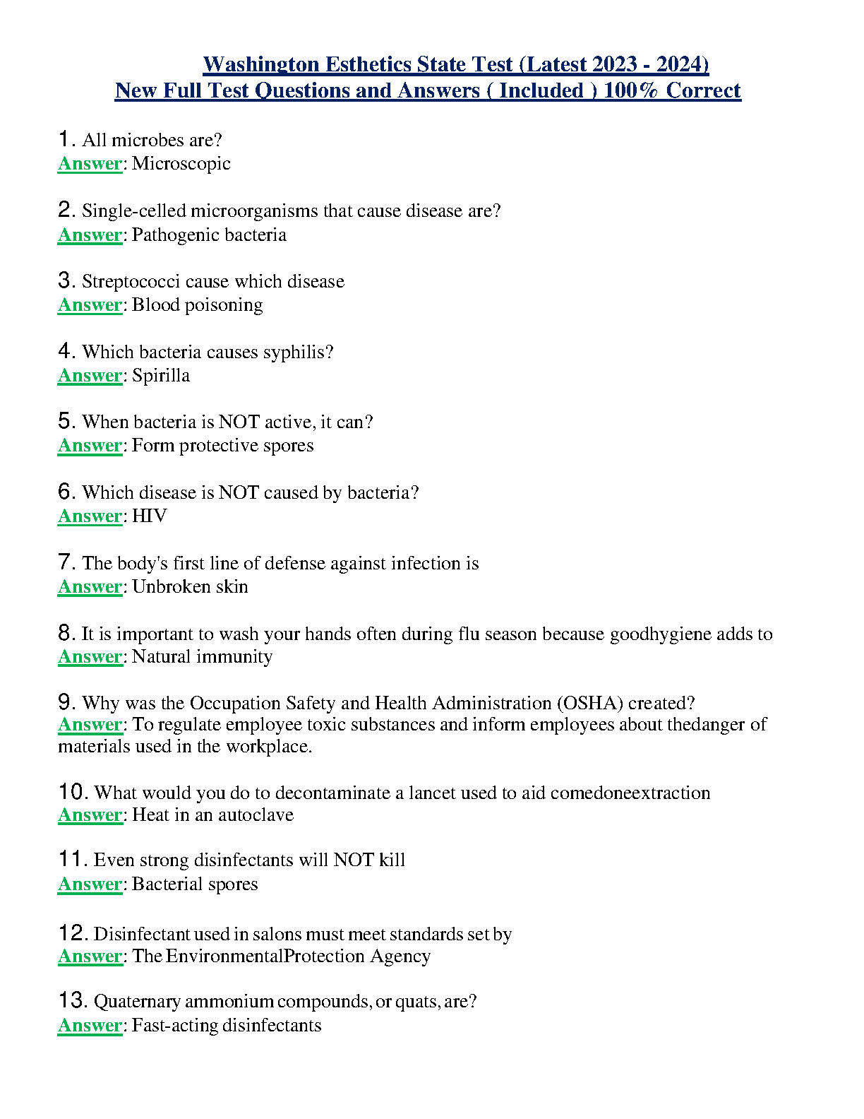 Ace your Washington Esthetics State Test with this comprehensive guide featuring 100% correct answers to the latest questions. This study resource is designed to help you pass your exam on the first attempt, ensuring you avoid costly resits. Master key concepts and boost your confidence with detailed explanations for each question.