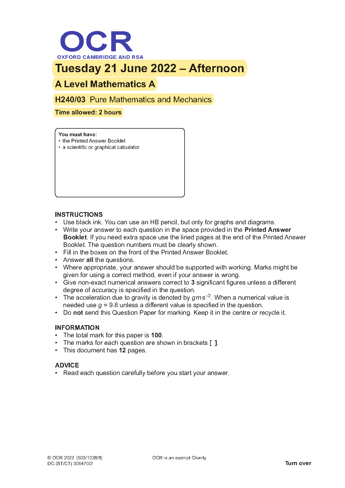 OCR A Level Mathematics A H240/03 Pure Mathematics and Mechanics June 2022 Exam Paper