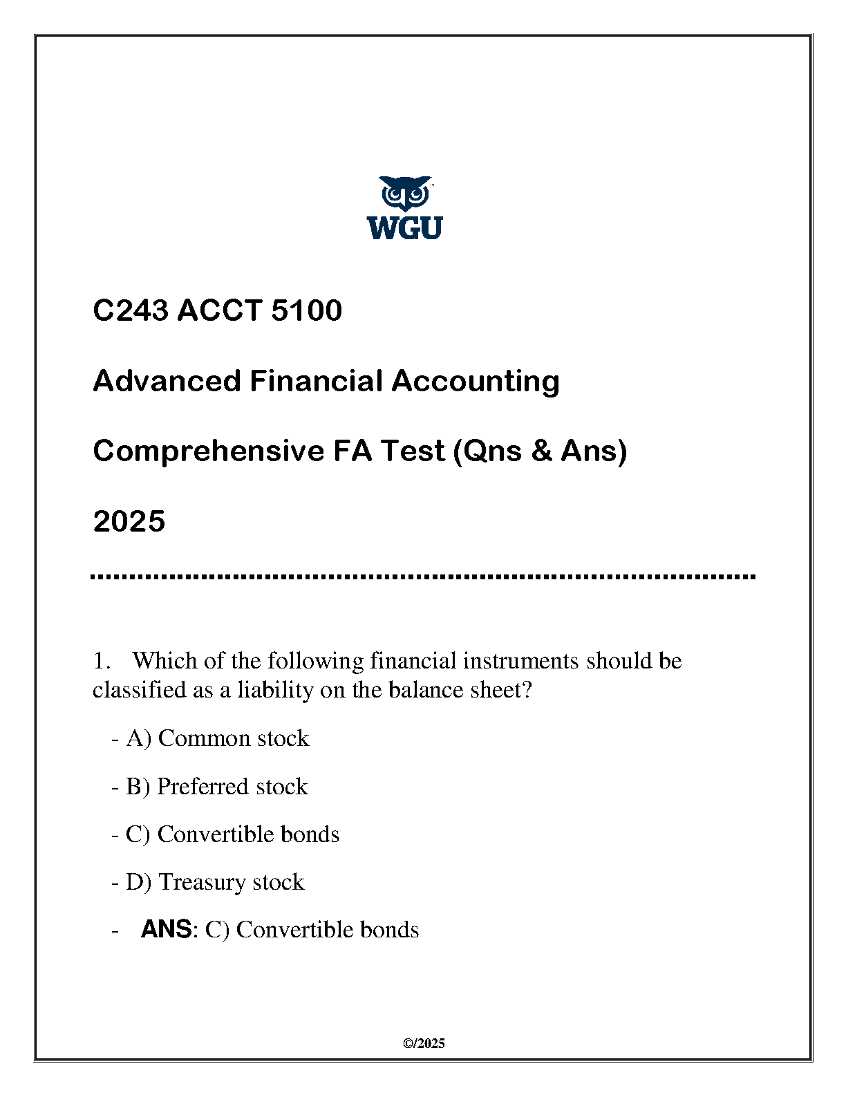 2025 WGU C243 ACCT 5100 Advanced Financial Accounting Comprehensive Exam Questions and Answers
