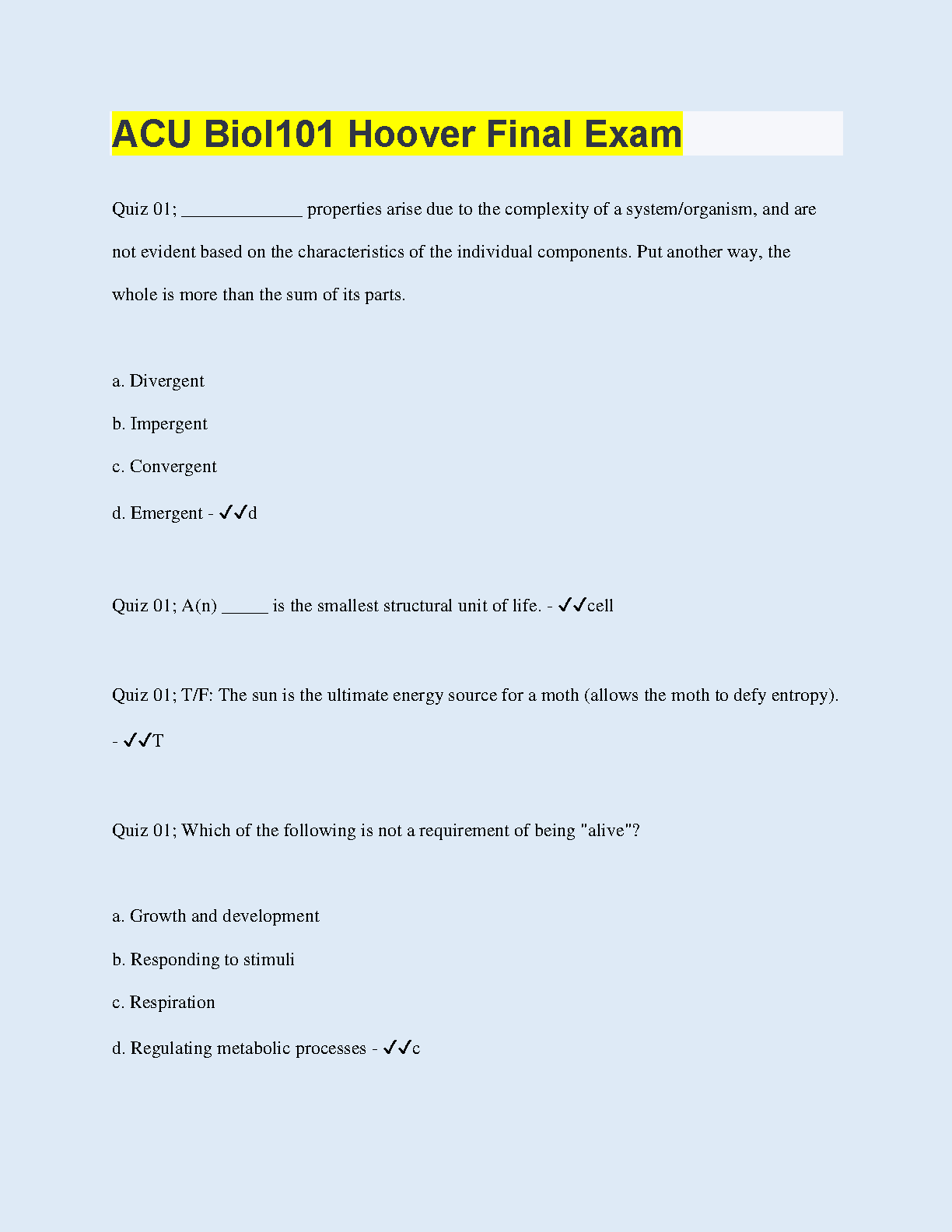 Prepare for the ACU Biol101 Final Exam with this comprehensive review guide. Designed to help students master key concepts and ace their exams on the first attempt. Includes practice questions and answers to reinforce learning and boost exam confidence. Avoid resits and succeed in your studies.