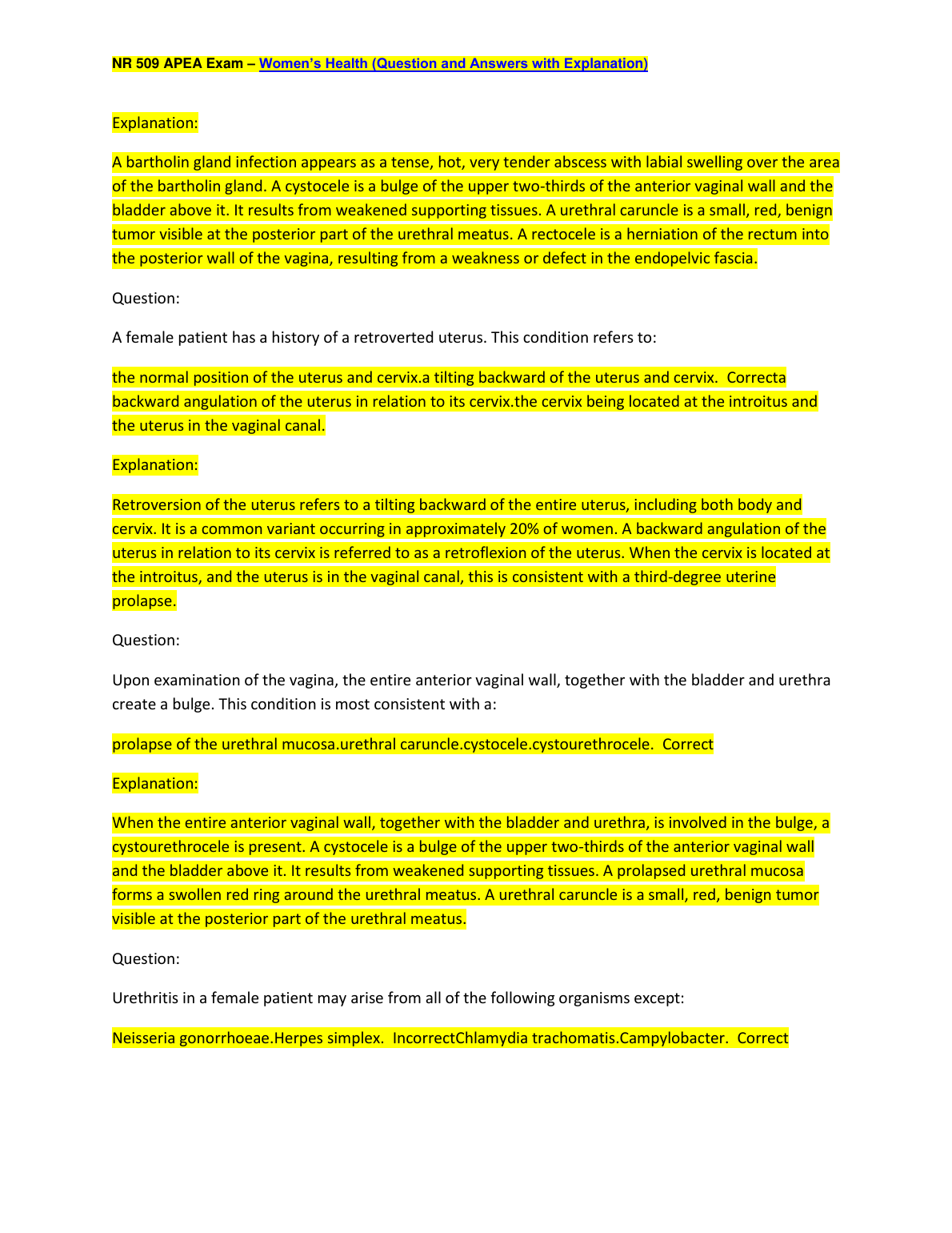 NR 509 APEA Exam – Women’s Health (Question and Answers with Explanation) BRAND NEW SOLUTION!!!