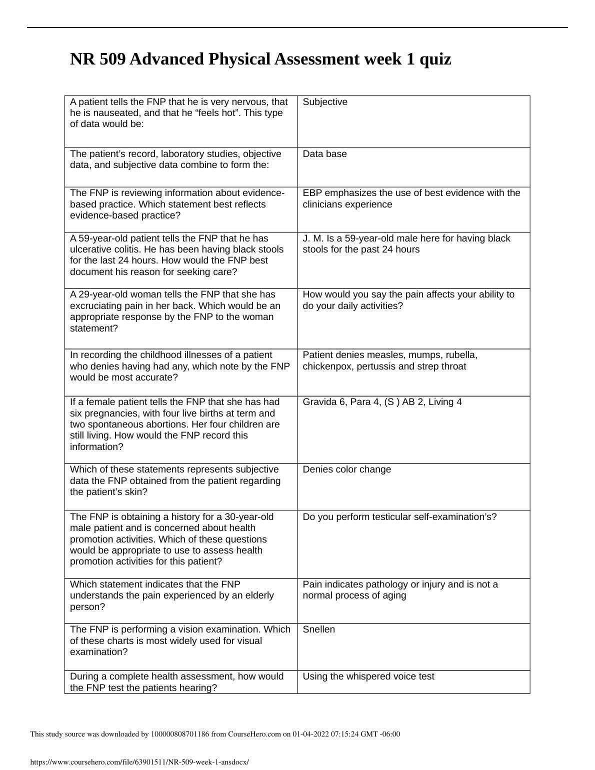 NR 509 Advanced Physical Assessment week 1 quiz WITH UPDATED SOLUTIONS