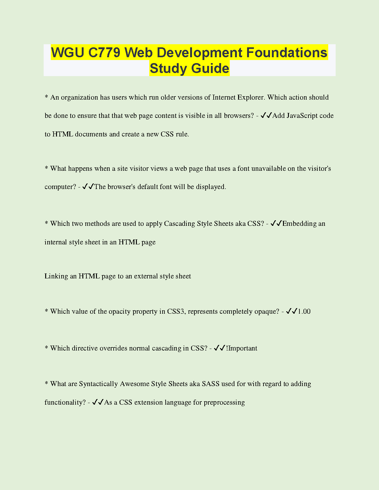 Master web development fundamentals with this comprehensive study guide designed to help WGU students pass the C779 exam on their first attempt. This resource covers key concepts such as JavaScript, CSS, and SASS, ensuring you're fully prepared for exam success and avoiding resits. Get ahead of the curve and achieve your academic goals.