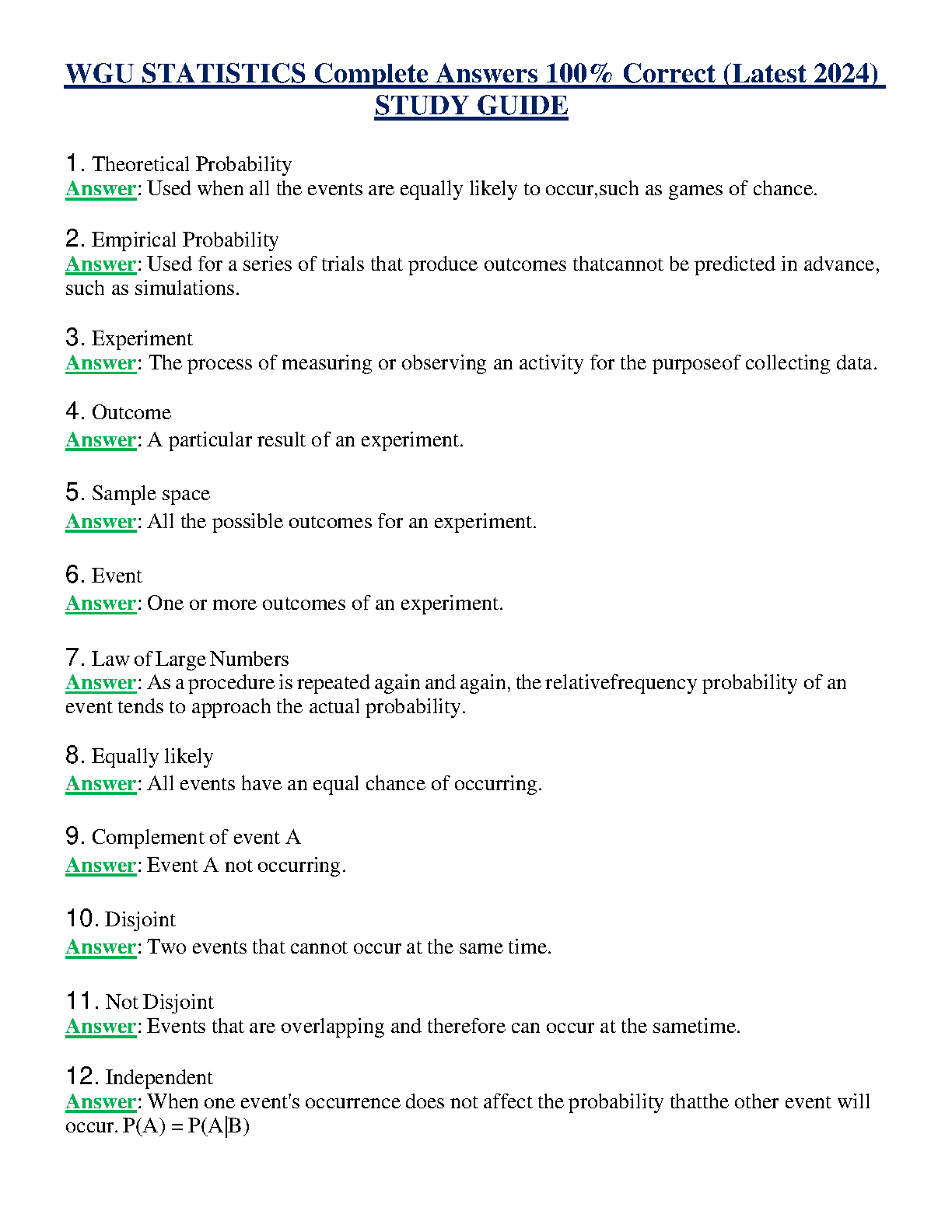 Ace your WGU Statistics exams with this comprehensive study guide, featuring 100% correct answers to key concepts. Master theoretical probability, empirical probability, experiments, outcomes, and more. This resource is designed to help you pass on your first attempt, avoiding costly resits.