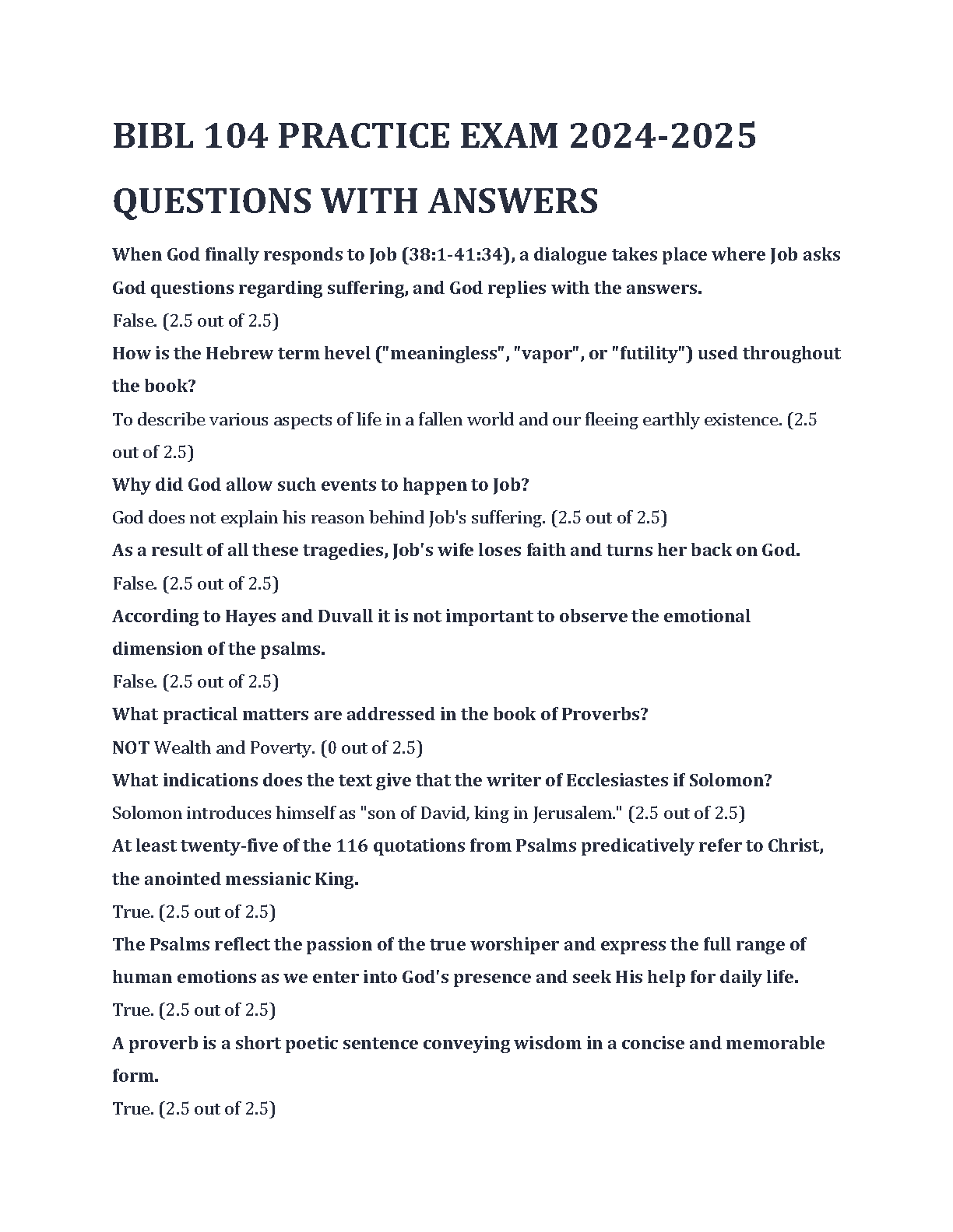 Prepare for your BIBL 104 exam with confidence! This comprehensive practice exam for the 2024-2025 academic year includes questions and answers covering key concepts. Designed to help you pass on your first try and avoid resits, this resource provides targeted practice for exam success.