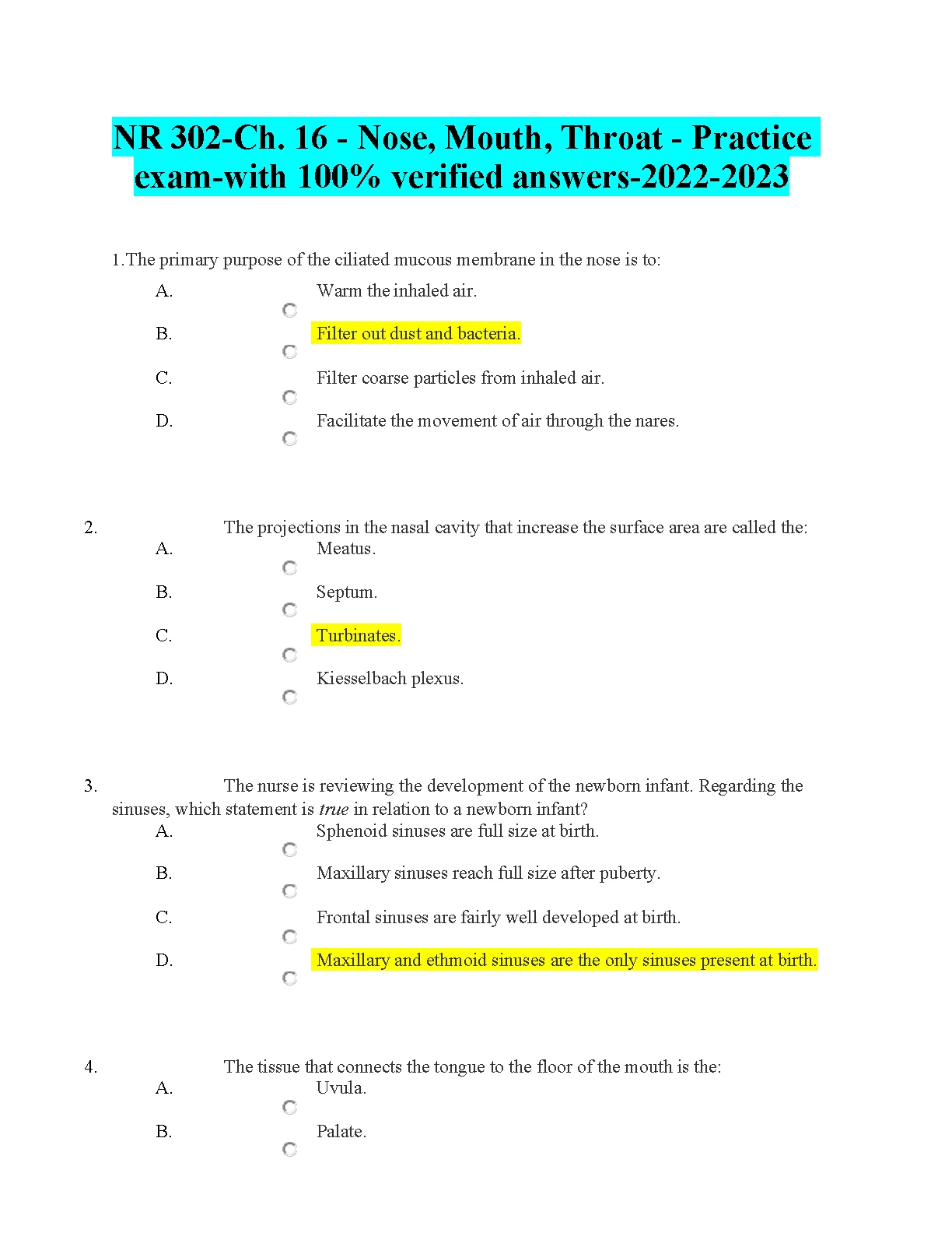 NR 302-Ch. 16 - Nose, Mouth, Throat - Practice exam-with 100% verified answers-2022/2023. DOWNLOAD on www.hackedexams.com INSTANTLY.