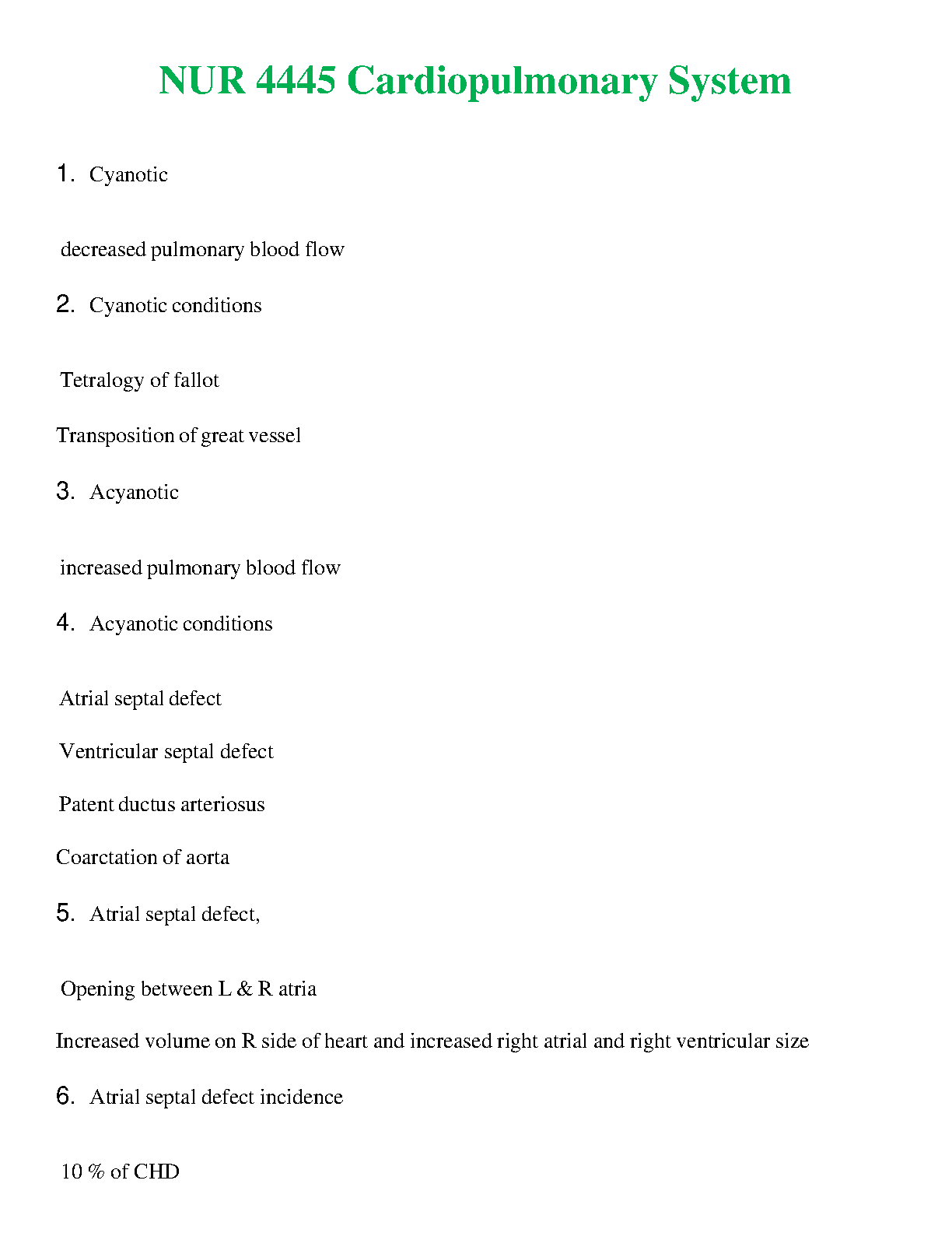 Master the cardiopulmonary system with these comprehensive NUR 4445 notes, designed to help you ace your exams on the first attempt. This resource covers key concepts such as cyanotic and acyanotic conditions, atrial septal defects, and more. Avoid resits and achieve academic excellence!