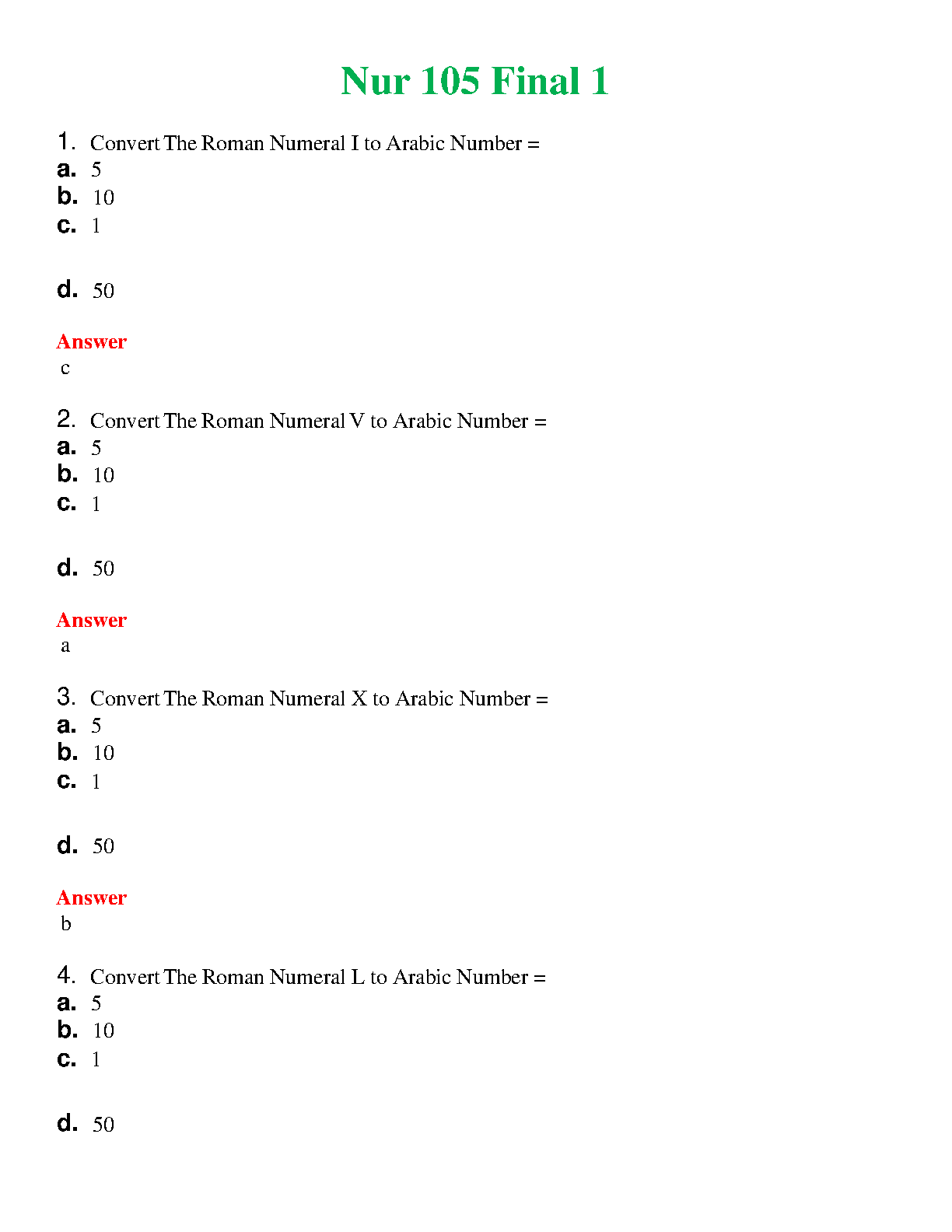 Conquer your Nur 105 final exam with confidence! This comprehensive guide is designed to help nursing students master key concepts and achieve exam success on their first attempt. Prepare effectively for your 2024-2025 academic year exams and avoid resits. This resource covers essential topics, including Roman numeral conversion and more.