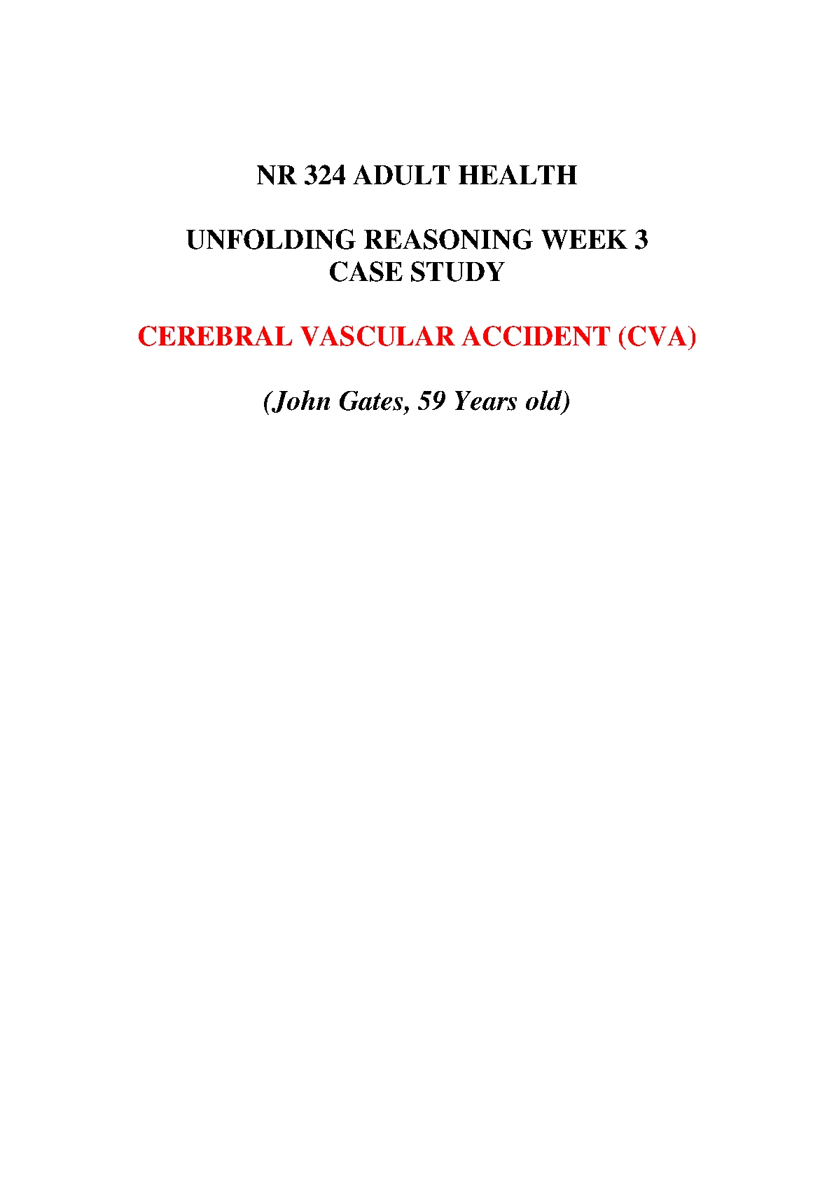 NR 324 ADULT HEALTH UNFOLDING REASONING WEEK 3 CASE STUDY CEREBRAL VASCULAR ACCIDENT (CVA) (John Gates, 59 Years old). DOWNLOAD on www.hackedexams.com INSTANTLY.