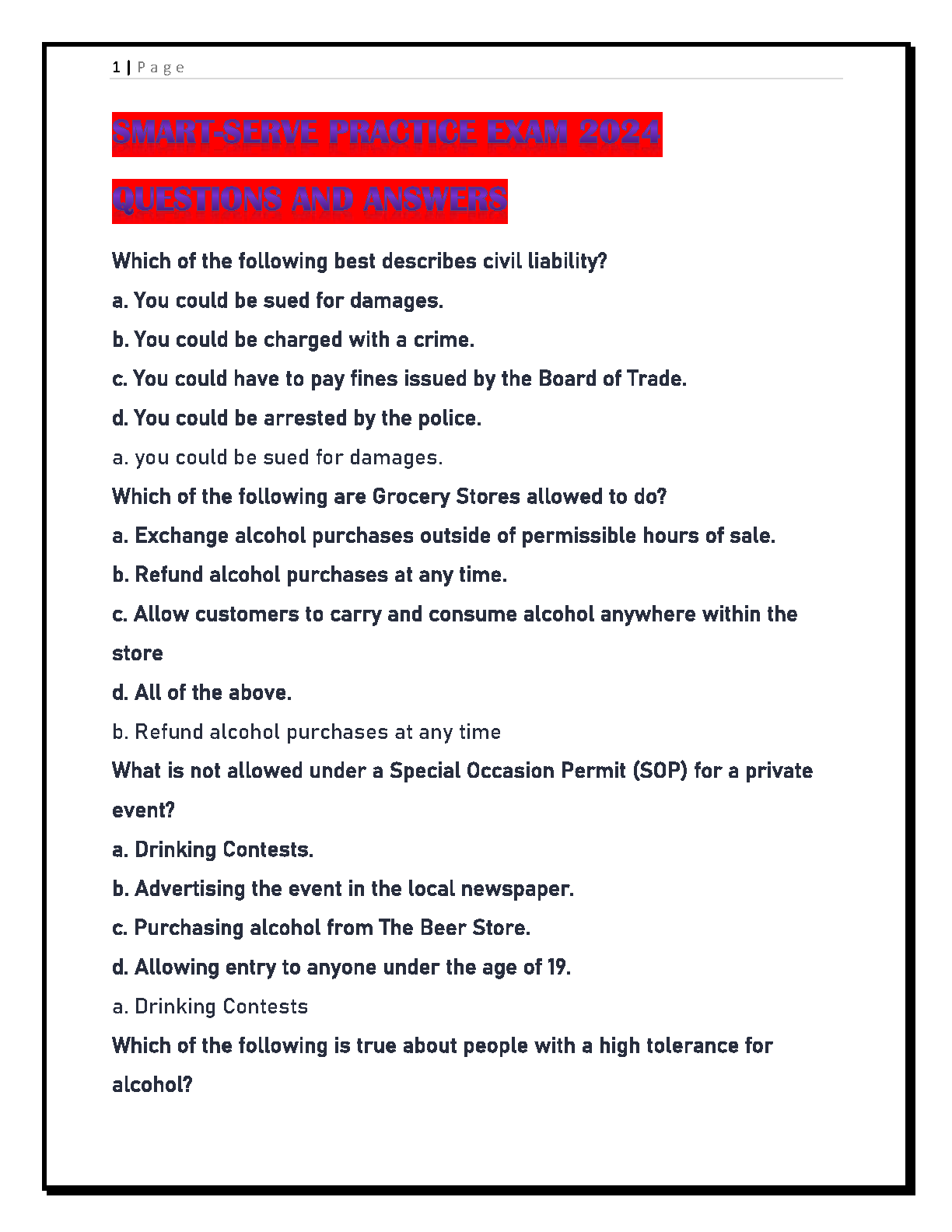 Ace your Smart Serve exam on the first try with this comprehensive 2024 practice exam. This resource includes questions and answers covering key topics to help you avoid resits and become a certified Smart Serve professional.