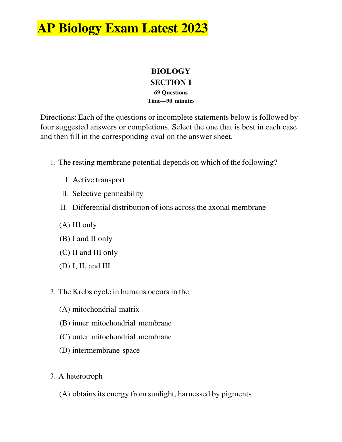 AP Biology Exam Latest 2023 EXAM REVIEW WITH SOLUTIONS GUARANTEED PASS QUESTUION BANK