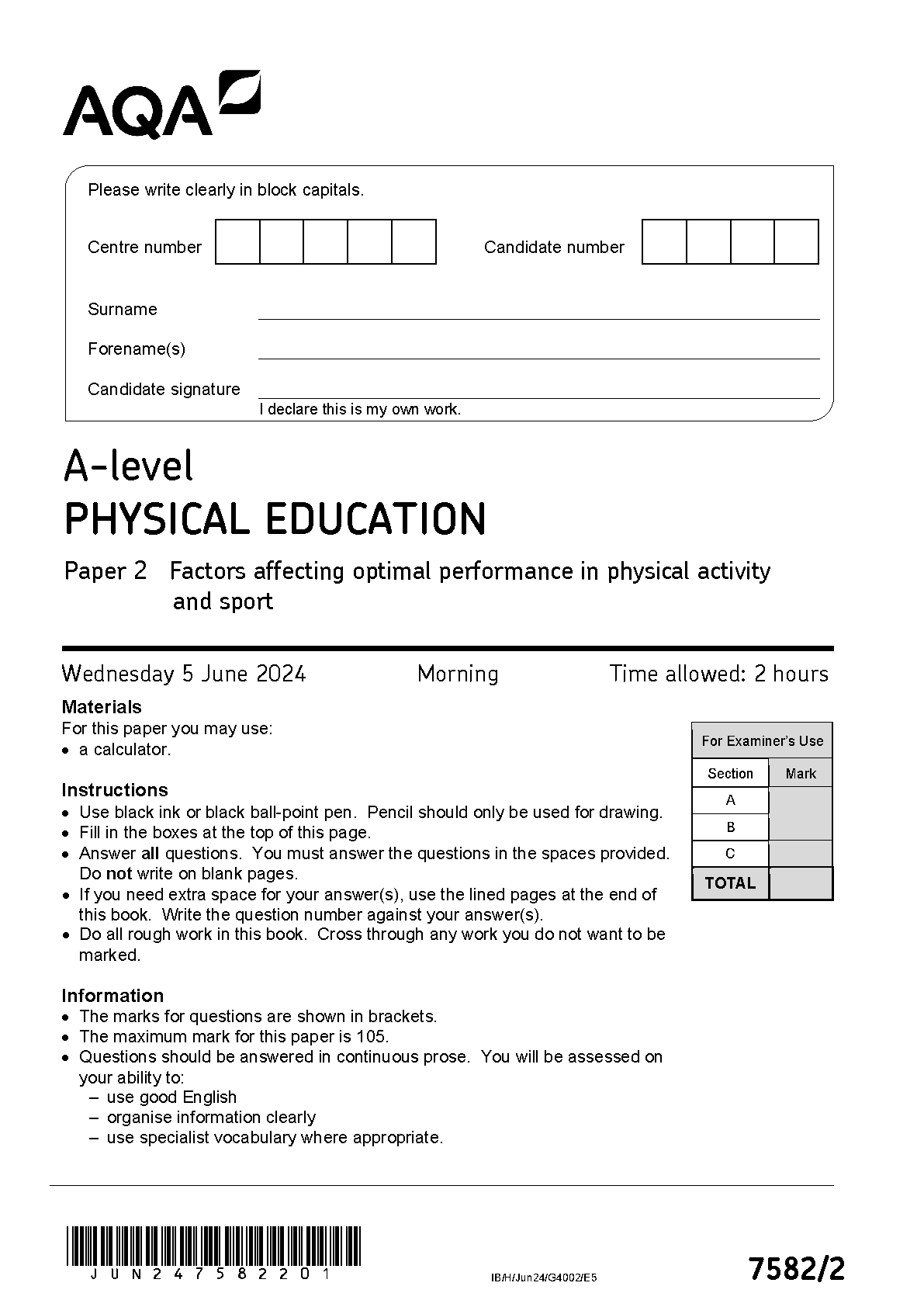 2024 AQA A-Level Physical Education Question Paper 2 (7582/2): Factors Affecting Optimal Performance in Physical Activity and Sport - Ace Your Exams!