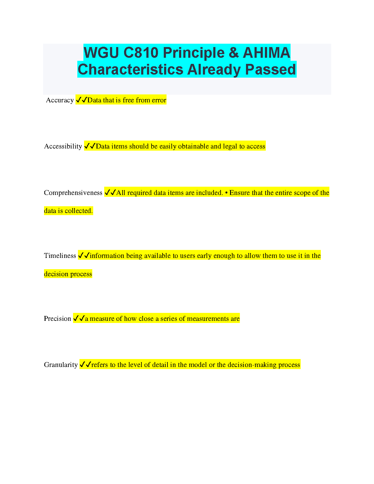 Ace your WGU C810 exam with this comprehensive guide covering AHIMA principles and data characteristics. Designed for first-time exam success, this resource ensures you understand accuracy, accessibility, comprehensiveness, timeliness, precision, and granularity – all crucial for passing on your first try. Avoid resits and achieve your academic goals!