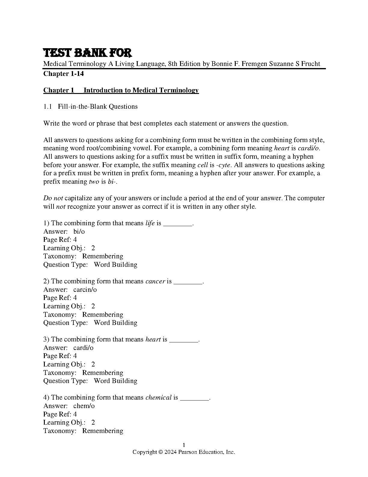 This comprehensive test bank for Medical Terminology A Living Language, 8th Edition, by Bonnie F. Fremgen and Suzanne S. Frucht, provides the perfect study tool for medical terminology students. Prepare effectively for your exams and master medical terminology concepts, guaranteeing first-attempt success and avoiding resits. This resource features fill-in-the-blank questions, ensuring a thorough understanding of word building and combining forms.