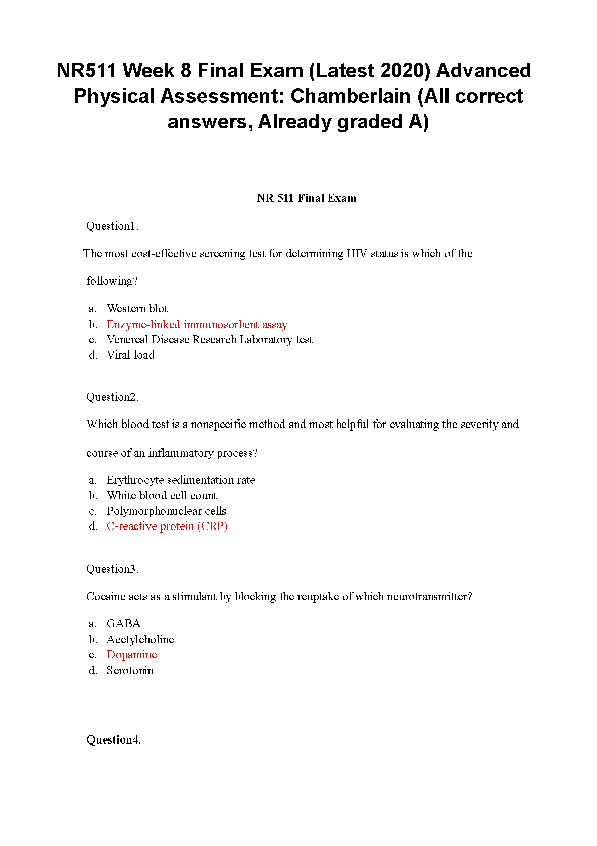 Ace your NR511 Week 8 Final Exam with this comprehensive question and answer guide. Chamberlain College of Nursing students, this resource contains all the correct answers to help you achieve an 'A' and avoid exam resits. Prepare effectively for the exam on your first attempt.