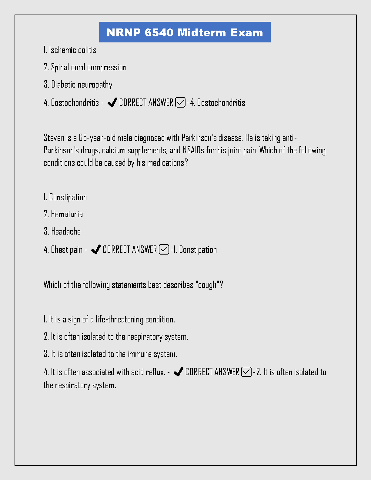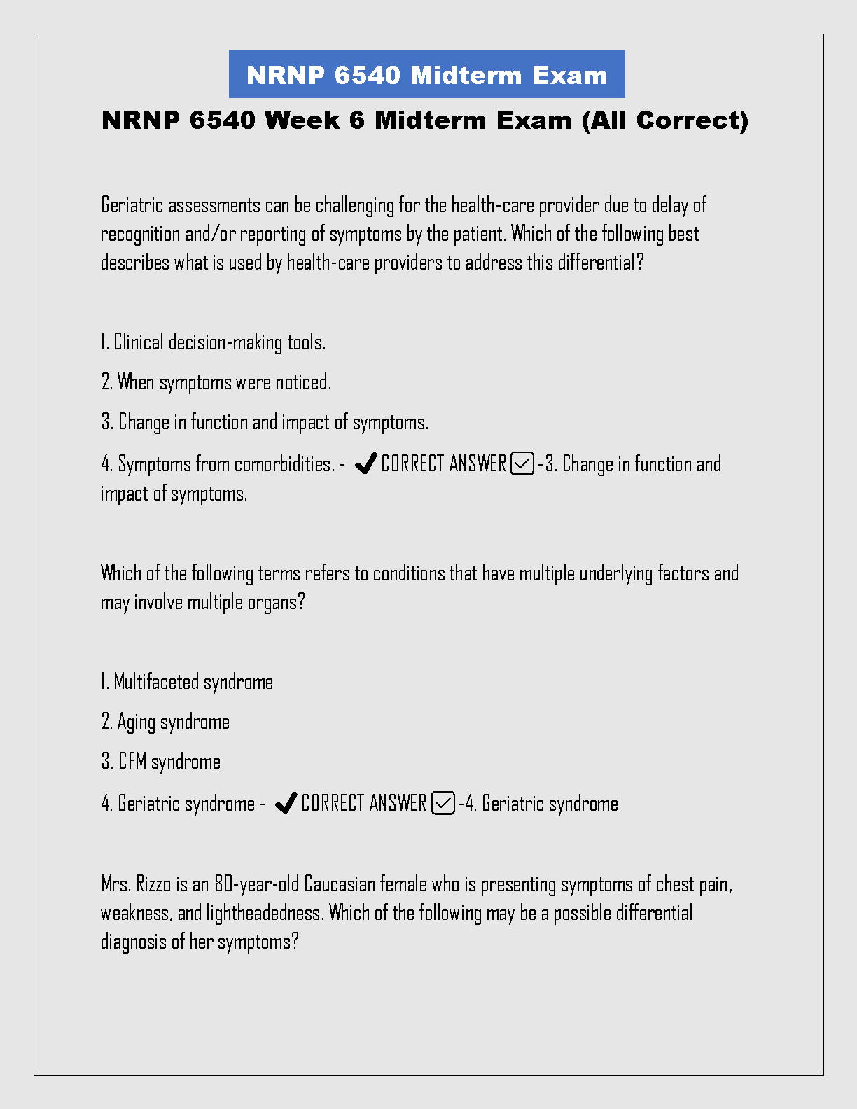 Ace your NRNP 6540 midterm exam with this comprehensive study guide. This 2024/2025 edition provides all correct answers to key questions, covering geriatric assessments and multi-organ conditions. Perfect for first-time exam takers, avoiding resits.
