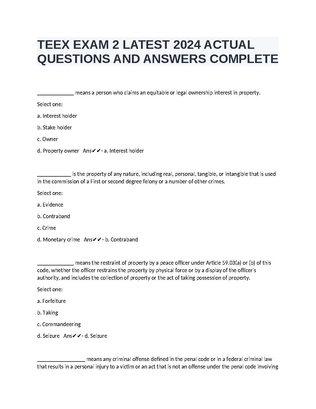 Ace your TEEX Exam 2 in 2024 with this comprehensive guide featuring actual questions and answers. This resource is designed to help you pass on your first attempt, eliminating the need for resits. Prepare effectively and confidently.