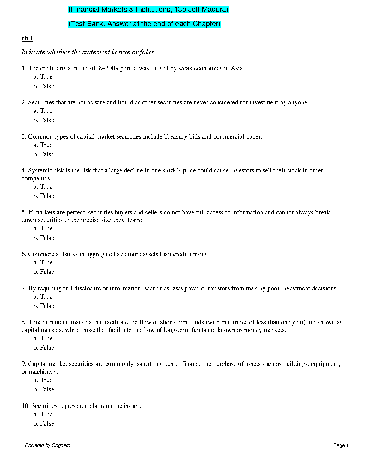 This comprehensive test bank accompanies the 13th edition of Jeff Madura's Financial Markets & Institutions. It's a valuable resource for instructors to create effective exams and quizzes, and for students preparing for assessments. Master the core concepts and ace your exams on the first try!