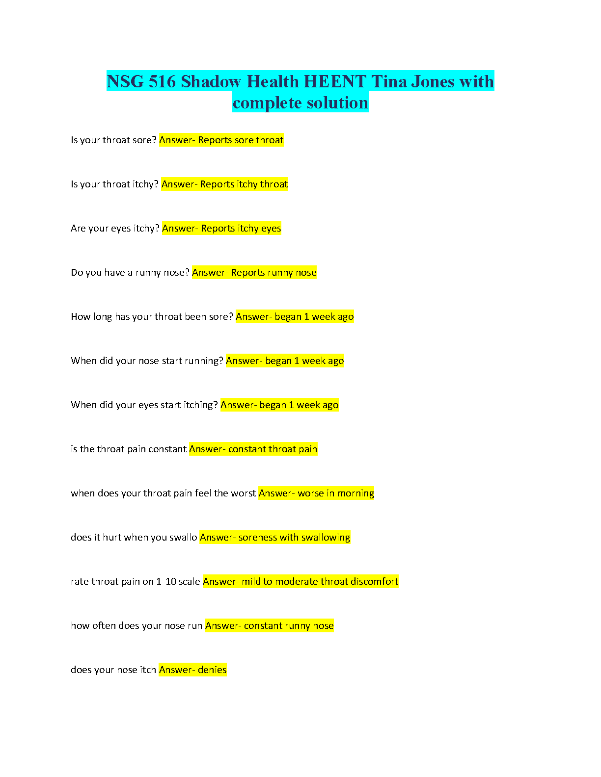 NSG 516 Shadow Health HEENT Tina Jones Complete Solution: A 2024-2025 Guide for Exam Success