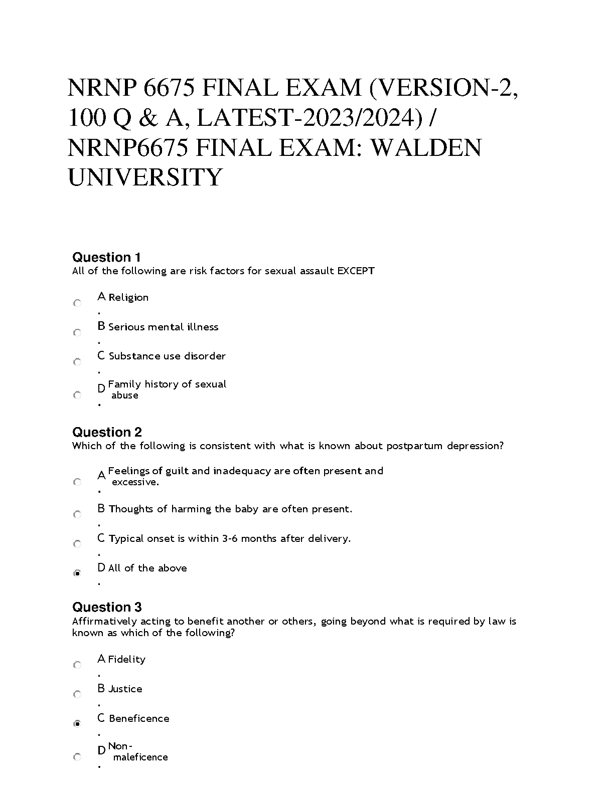Ace your NRNP 6675 final exam with this comprehensive question bank featuring 100 questions and answers, updated for the 2023-2024 academic year. Prepare effectively for Walden University's NRNP 6675 course and boost your exam score.
