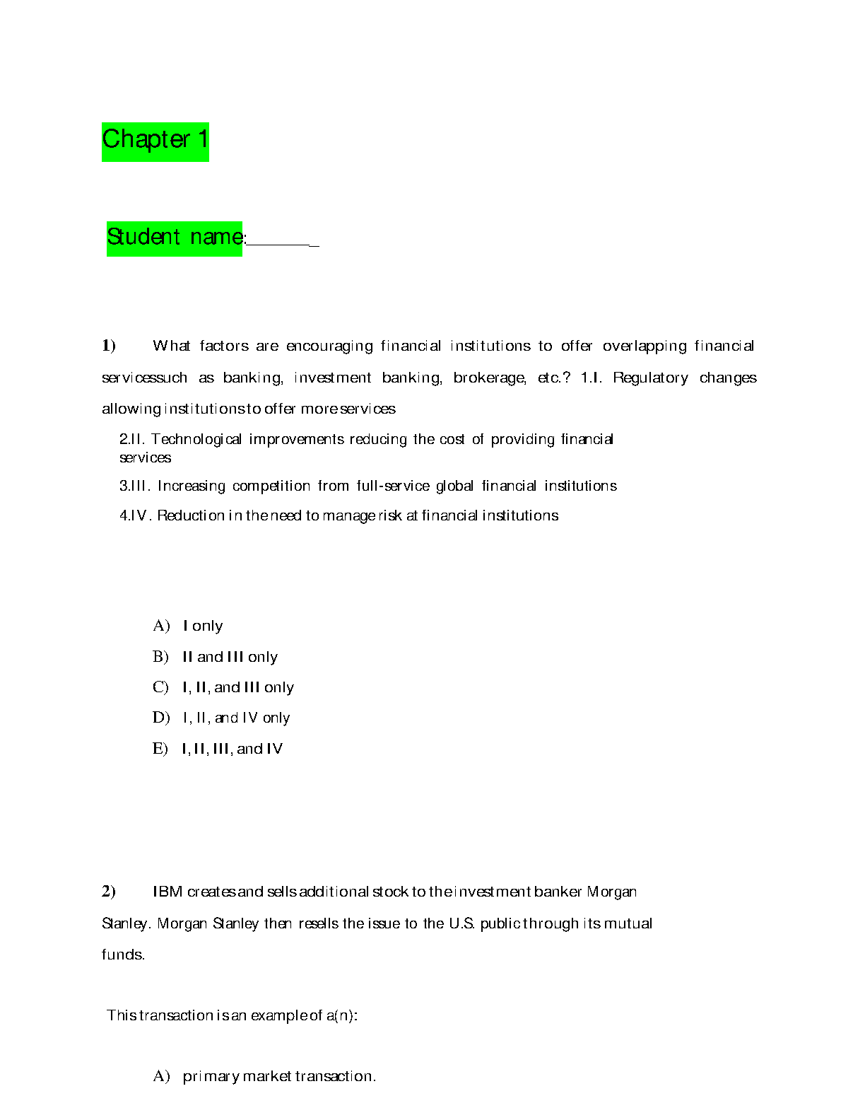 Ace your Financial Markets and Institutions exams with this comprehensive test bank for the 8th edition by Anthony Saunders and Marcia Cornett. This resource covers all 25 chapters, providing a complete set of practice questions to help you master the material and achieve exam success on your first attempt. Avoid resits and boost your confidence with this updated, newest version.