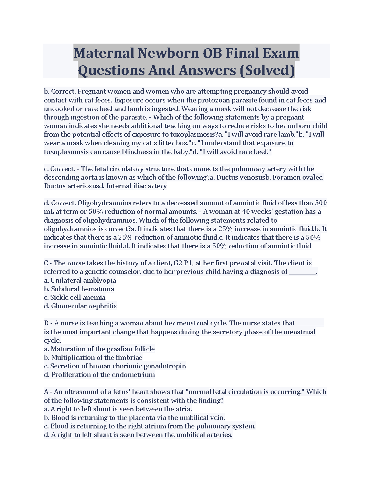Ace your Maternal Newborn OB final exam with this comprehensive guide featuring solved questions and answers. This 2024/2025 edition is designed to help students pass on their first attempt, eliminating the need for resits. Master key concepts and boost your confidence before exam day!