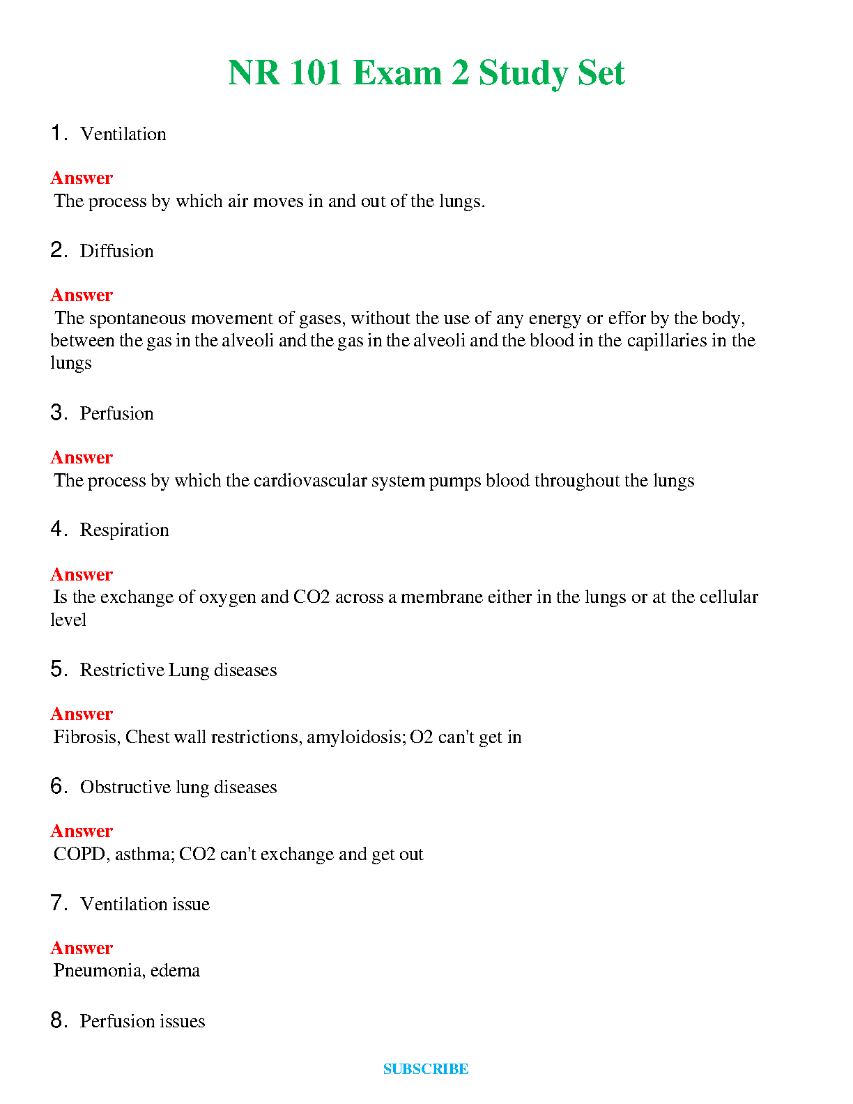 Ace your NR 101 Exam 2 with this detailed study set. This resource covers key concepts such as ventilation, diffusion, perfusion, and respiratory diseases, providing clear explanations and examples to help you achieve exam success on your first try. Avoid resits and master the material with ease!