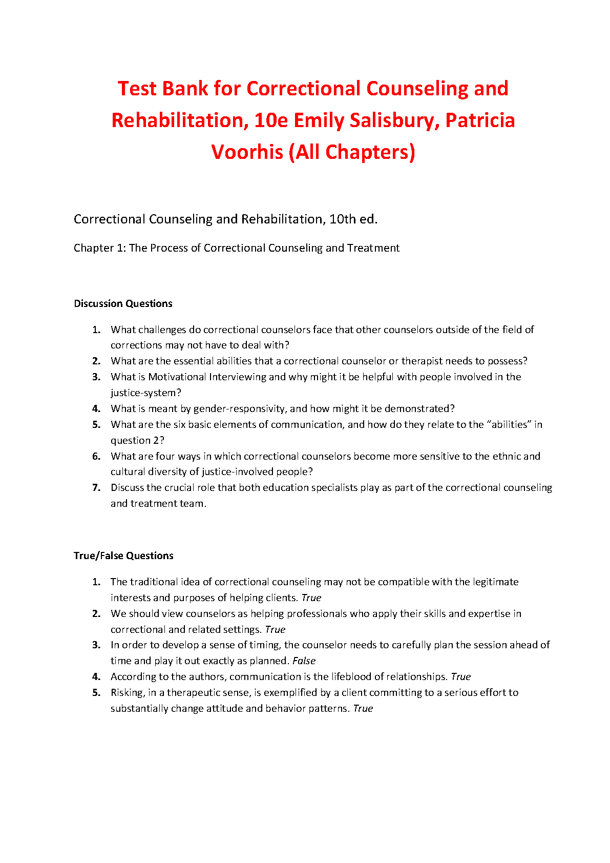 Test Bank for Correctional Counseling and Rehabilitation, 10th Edition by Emily Salisbury and Patricia Voorhis