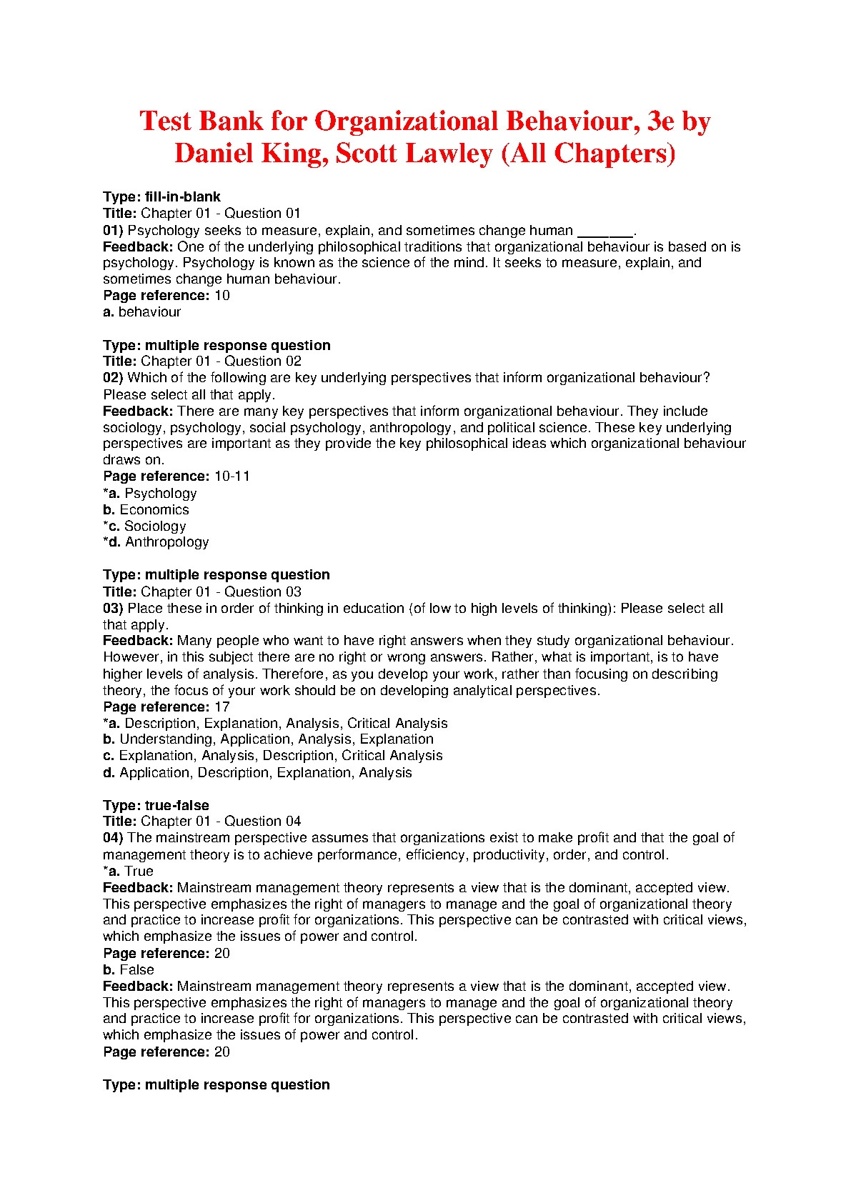 Test Bank for Organizational Behaviour, 3rd Edition by Daniel King and Scott Lawley: Ace Your Exams!