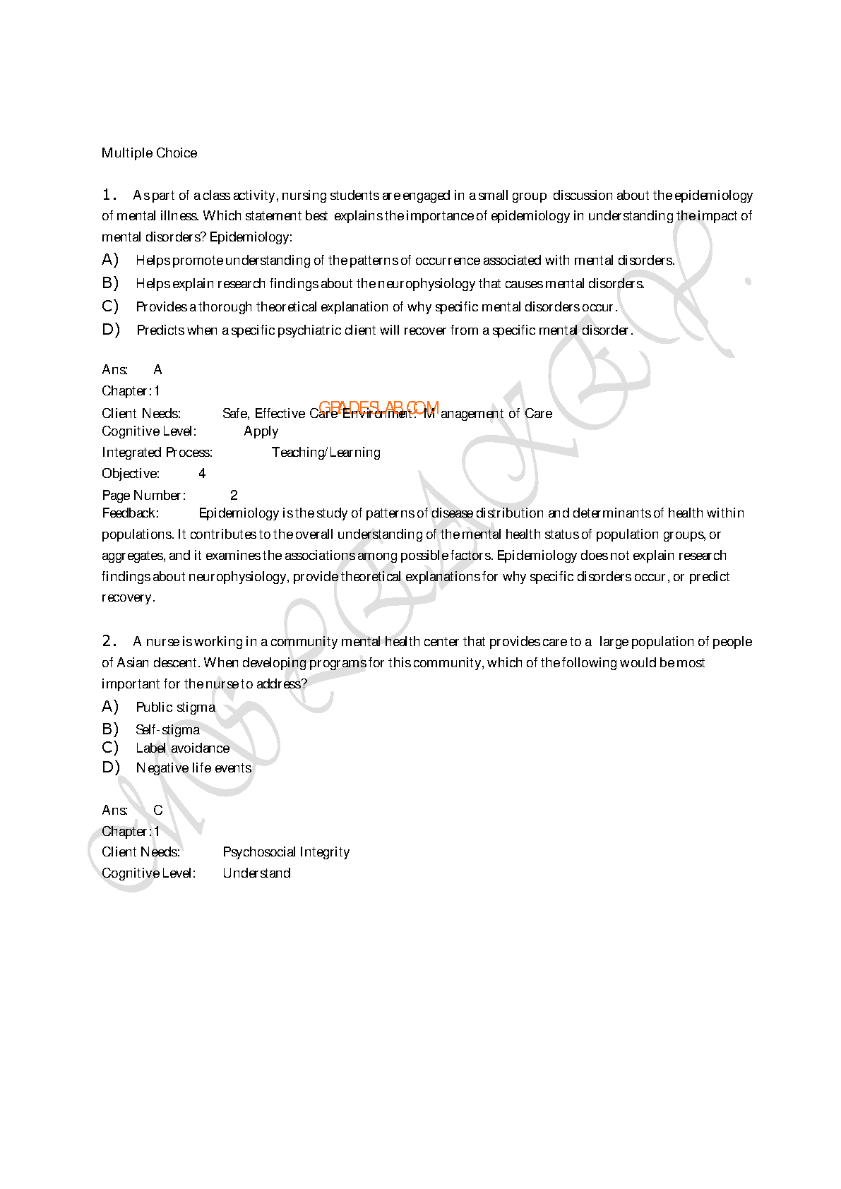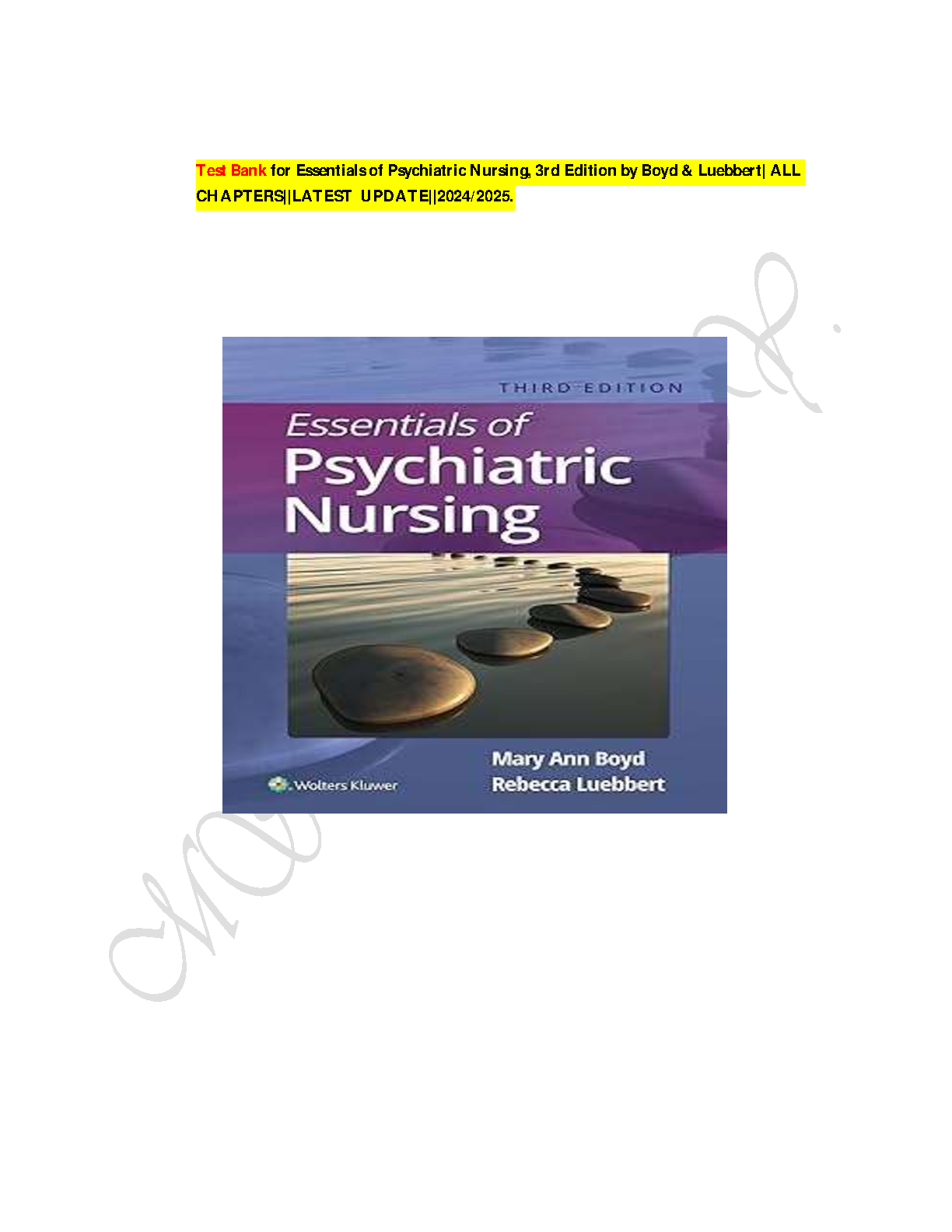 Master psychiatric nursing with this comprehensive test bank for Essentials of Psychiatric Nursing, 3rd edition, by Mary Ann Boyd and Rebecca Luebbert. This updated 2024/2025 resource covers all chapters, ensuring you're fully prepared for exams and avoid resits. Gain confidence and achieve your academic goals.