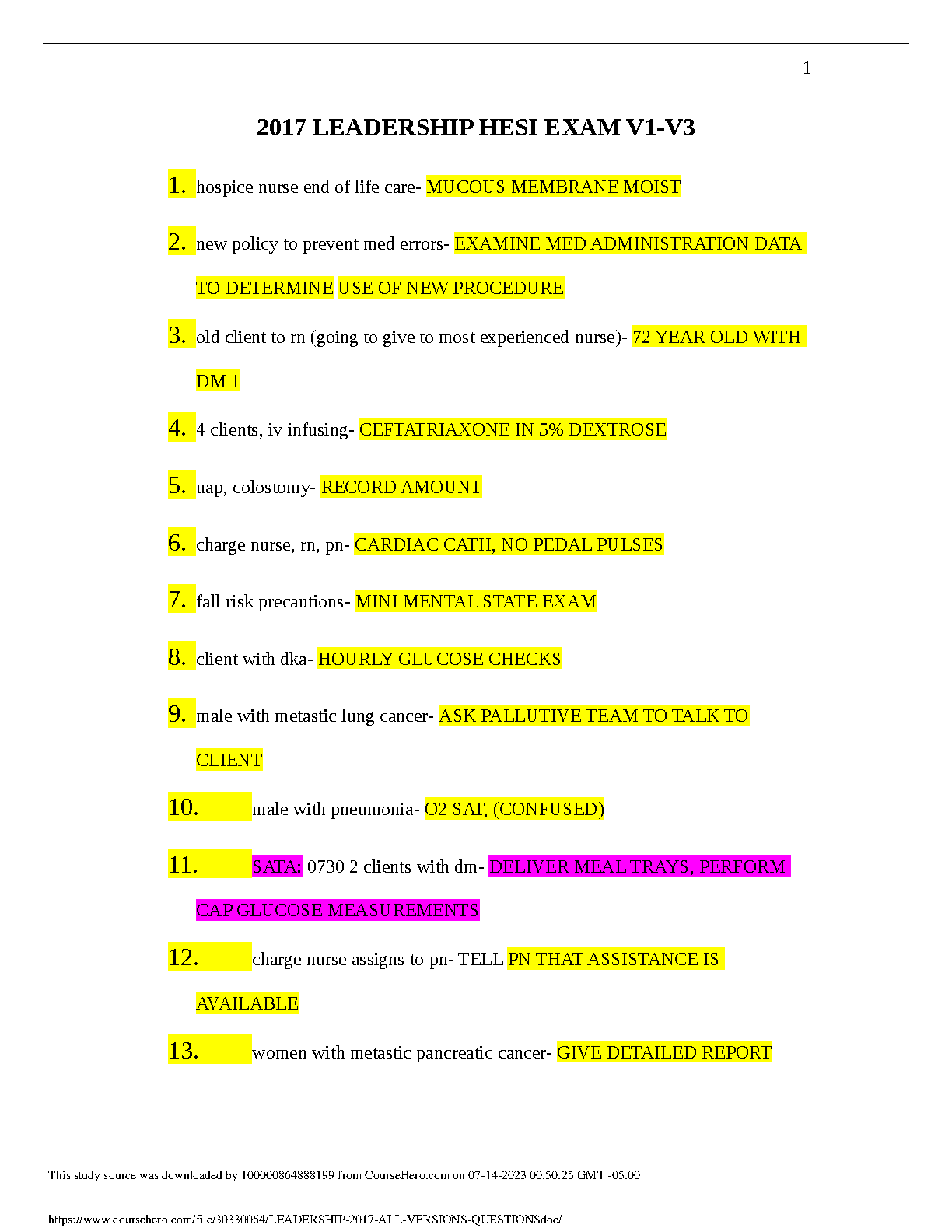2017 Leadership HESI Exam V1-V3 Practice Questions and Answers