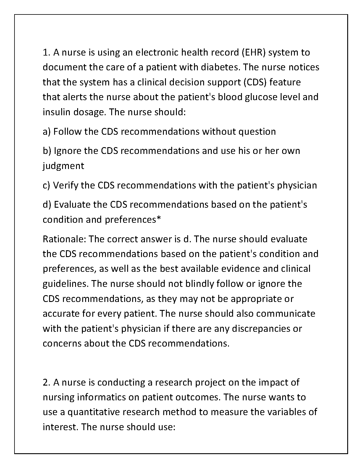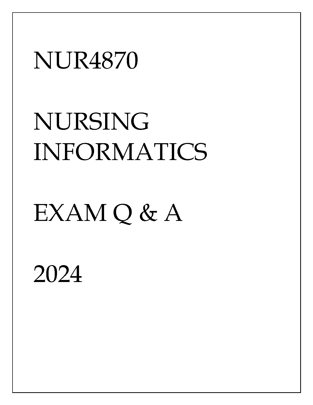 Conquer your NUR4870 Nursing Informatics exam with this comprehensive 2024 question and answer resource. Designed to help students pass their exams on the first attempt and avoid resits, this study guide provides a targeted approach to mastering the subject matter. Prepare efficiently and confidently for exam success.