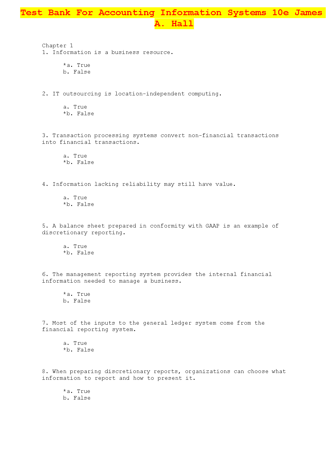 Test Bank for Accounting Information Systems, 10th Edition by James A. Hall