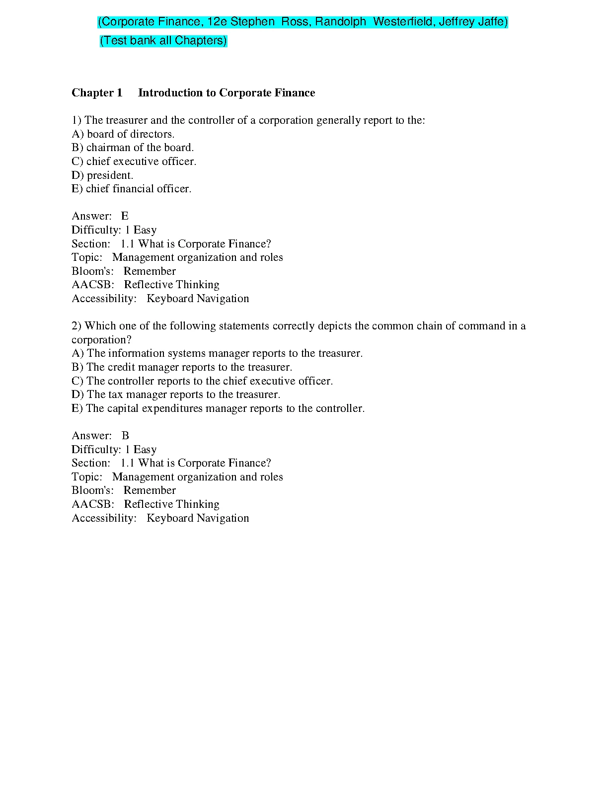 Corporate Finance 12th Edition Test Bank by Stephen Ross, Randolph Westerfield, and Jeffrey Jaffe