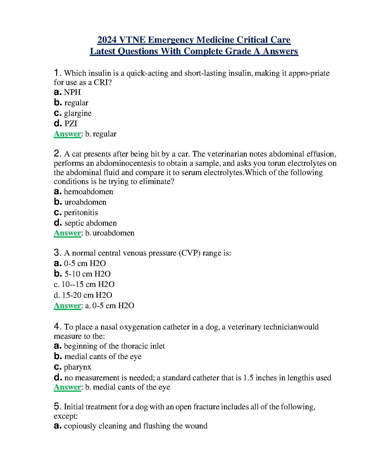 Ace your 2024 VTNE Emergency Medicine Critical Care exam with this comprehensive resource featuring the latest questions and detailed, grade-A answers. Prepare effectively, avoid resits, and pass on your first attempt. This study guide ensures a thorough understanding of critical concepts.