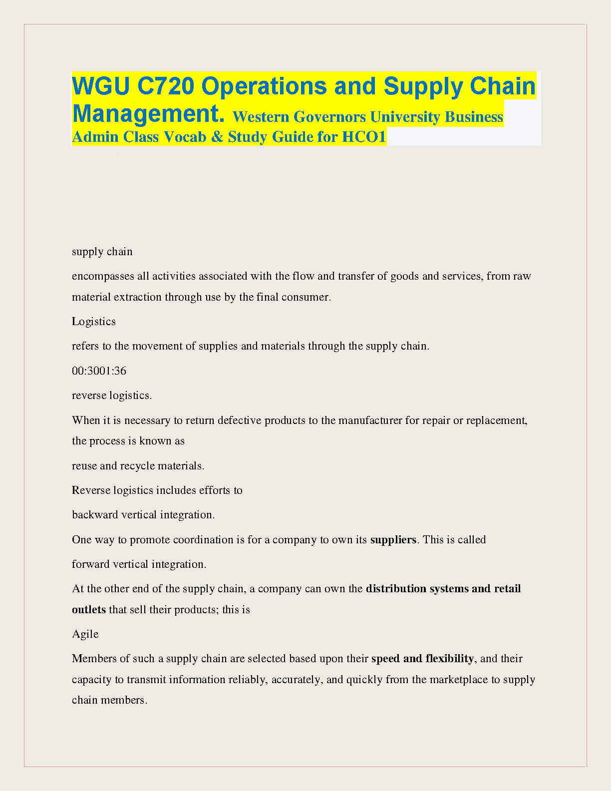 Master WGU C720 Operations and Supply Chain Management with this comprehensive study guide, designed to help you pass your exams on the first attempt. This resource covers key concepts, including supply chain logistics, reverse logistics, vertical integration, and agile supply chain principles. Prepare for success in the 2024/2025 academic year!