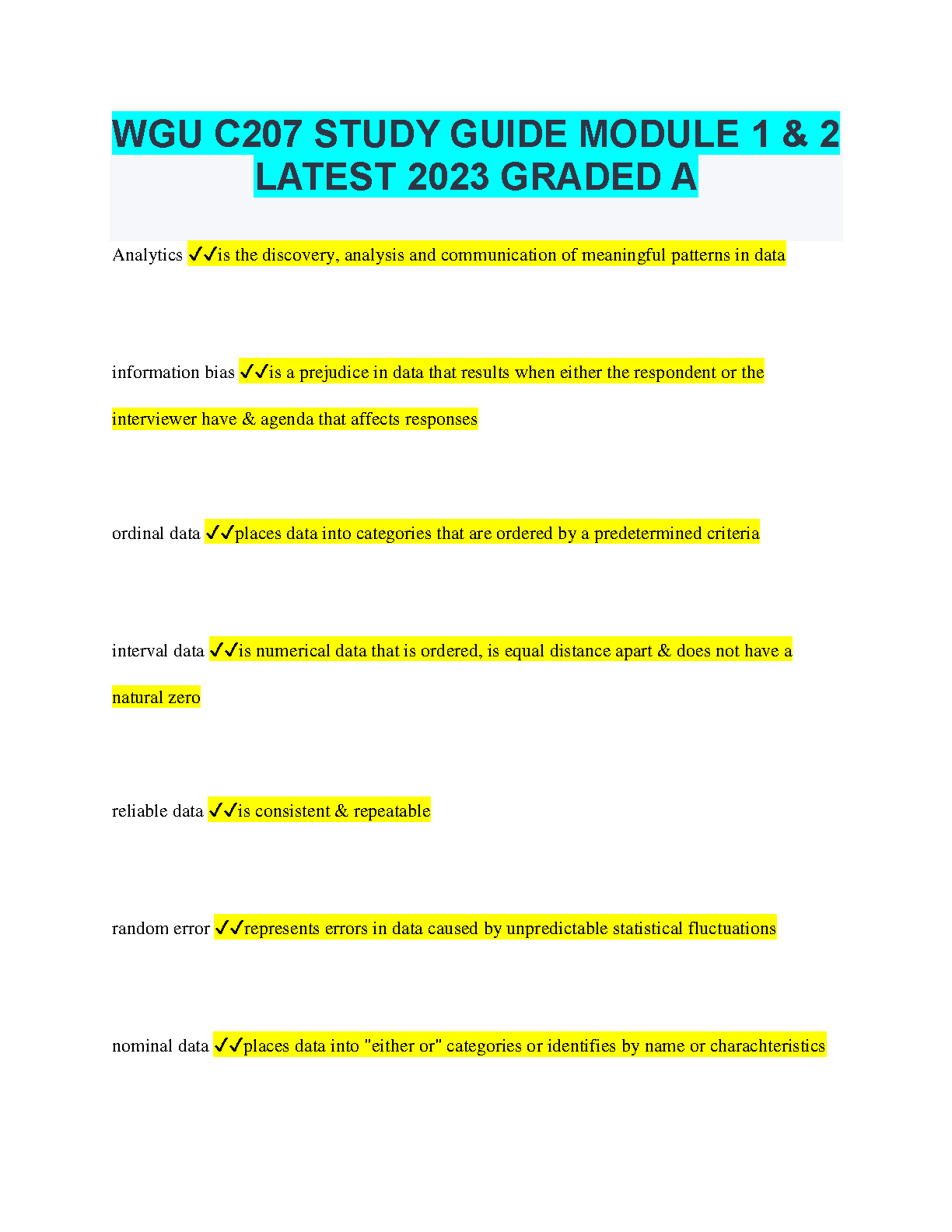 Ace your WGU C207 exam on the first attempt with this comprehensive study guide covering Modules 1 & 2. This resource includes key concepts, definitions, and explanations, ensuring a thorough understanding of data analytics and bias. Avoid resits and achieve a top grade!