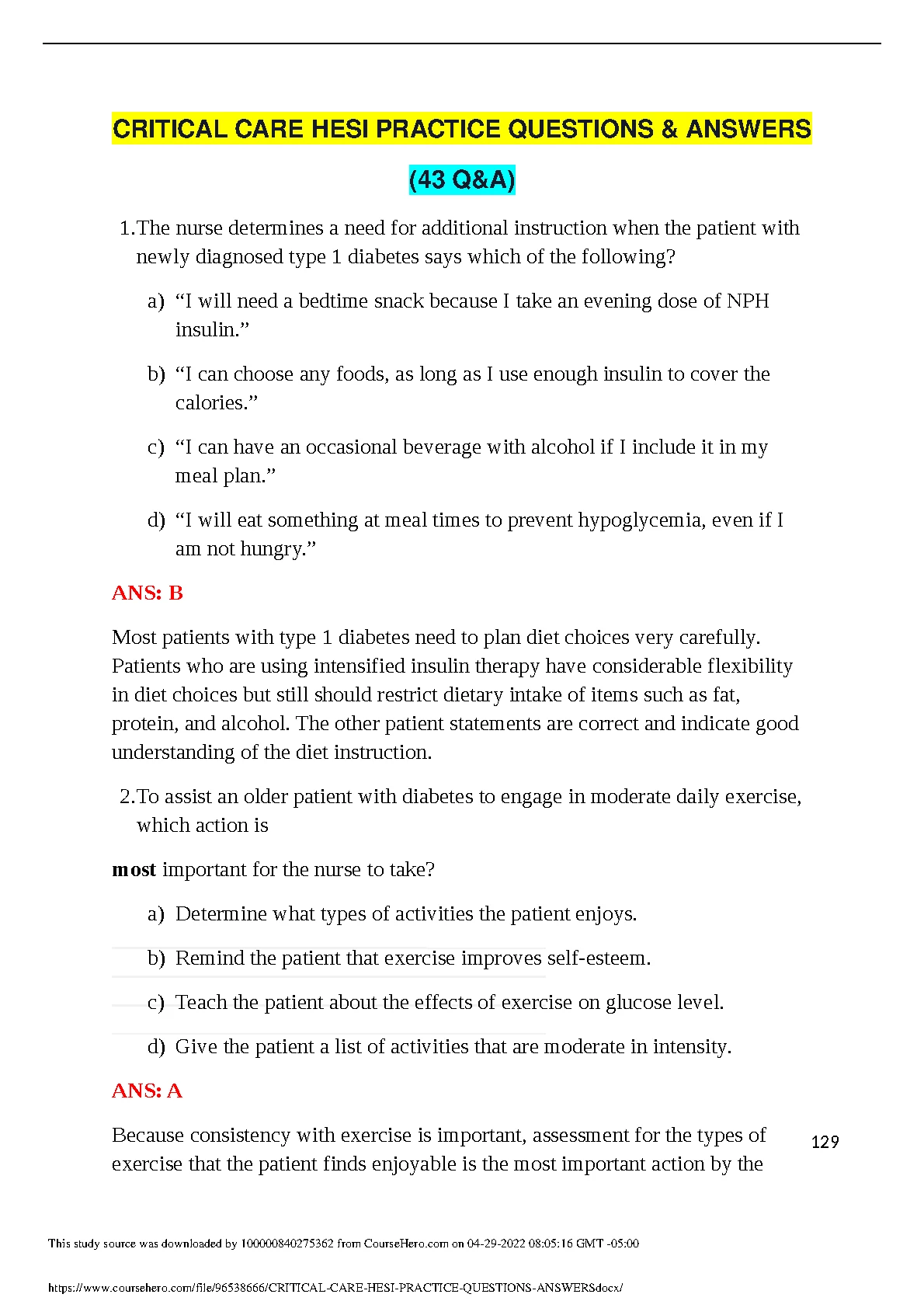 CRITICAL CARE HESI PRACTICE QUESTIONS & ANSWERS (43 Q&A) 2023/2024
