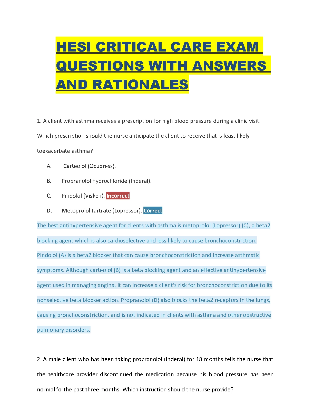 HESI CRITICAL CARE EXAM QUESTIONS WITH ANSWERS AND RATIONALES COMPLETE SOUTION