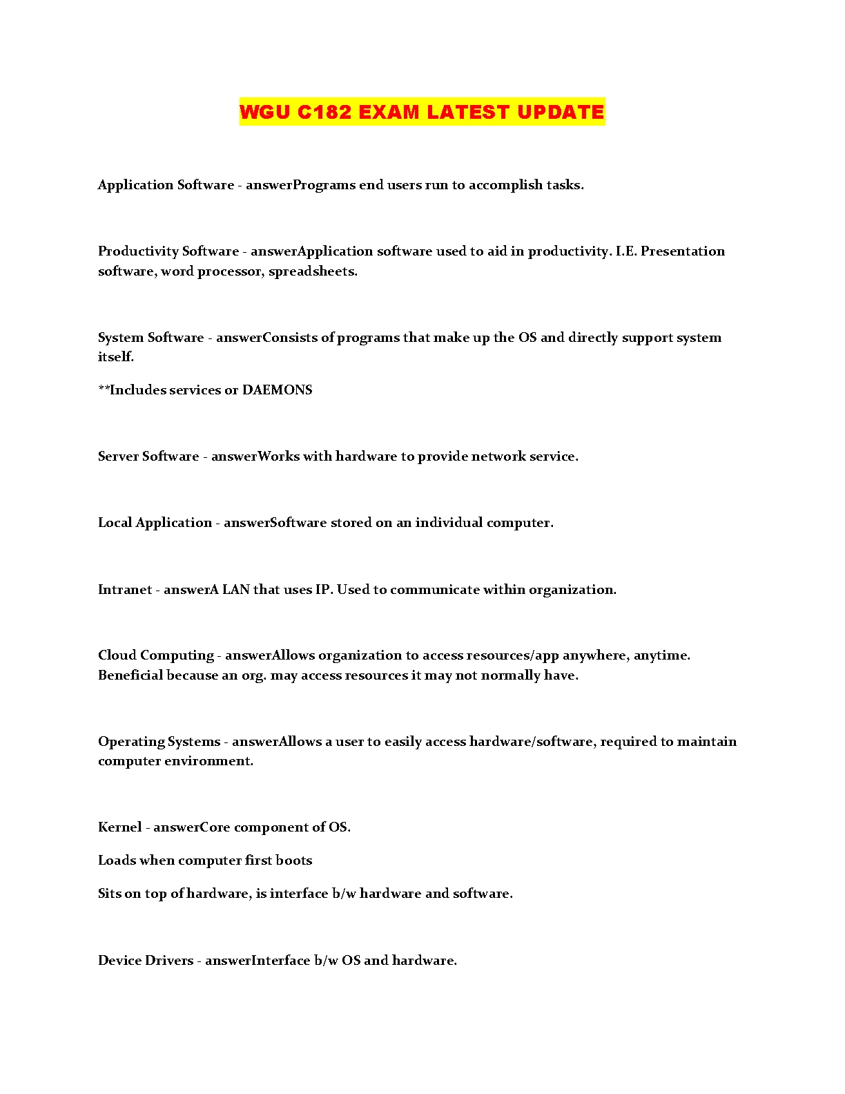 Conquer your WGU C182 exam with this comprehensive guide. This latest 2024-2025 update covers key concepts such as application software, productivity software, system software, server software, local applications, intranets, cloud computing, operating systems, kernels, and device drivers. Designed to help students pass their exams with confidence and avoid resits.