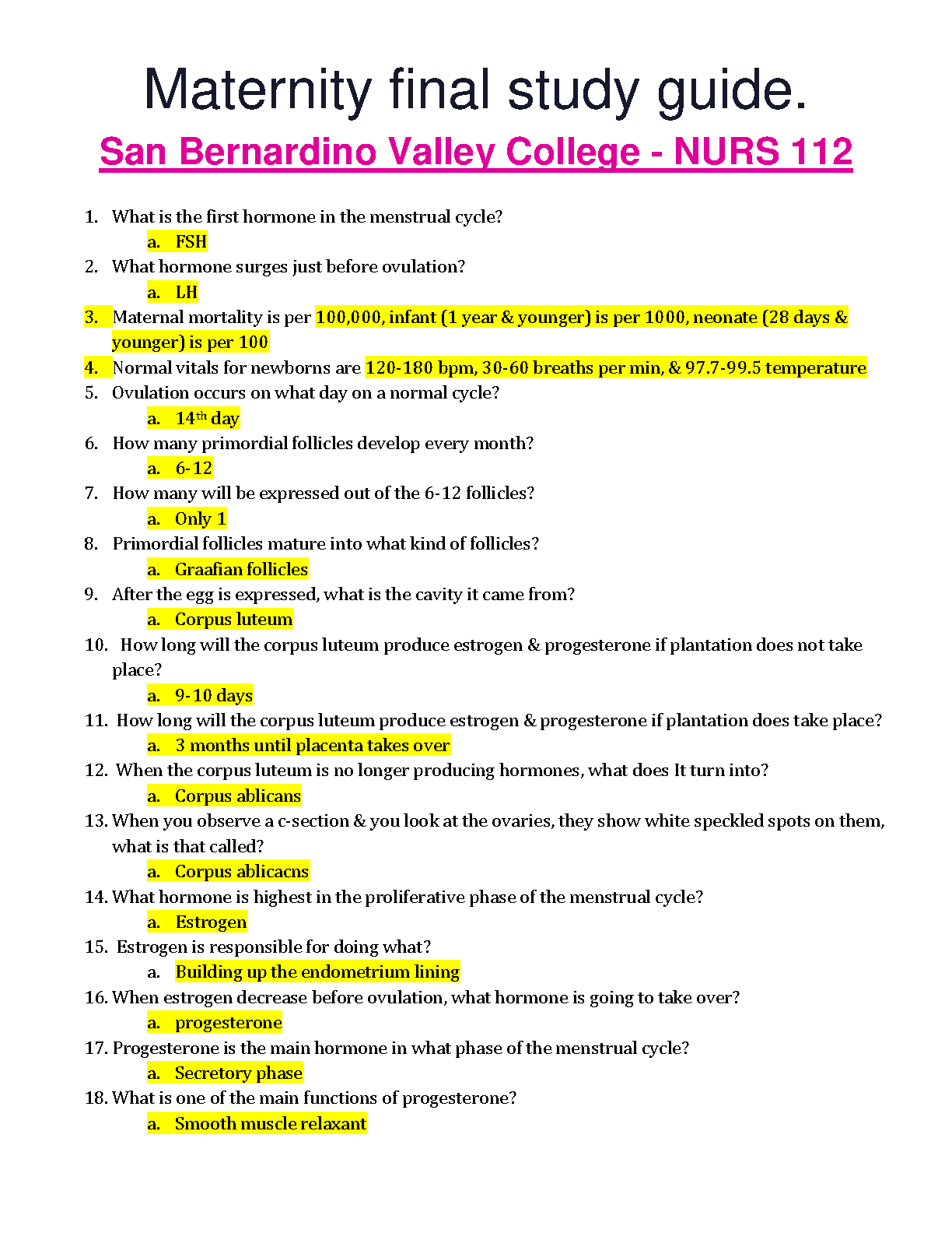 Ace your NURS 112 Maternity final exam at San Bernardino Valley College with this comprehensive study guide. This resource covers key concepts, including hormonal cycles, fetal development, and maternal health, ensuring you're well-prepared for exam success and avoiding resits. Designed for the 2024-2025 academic year.