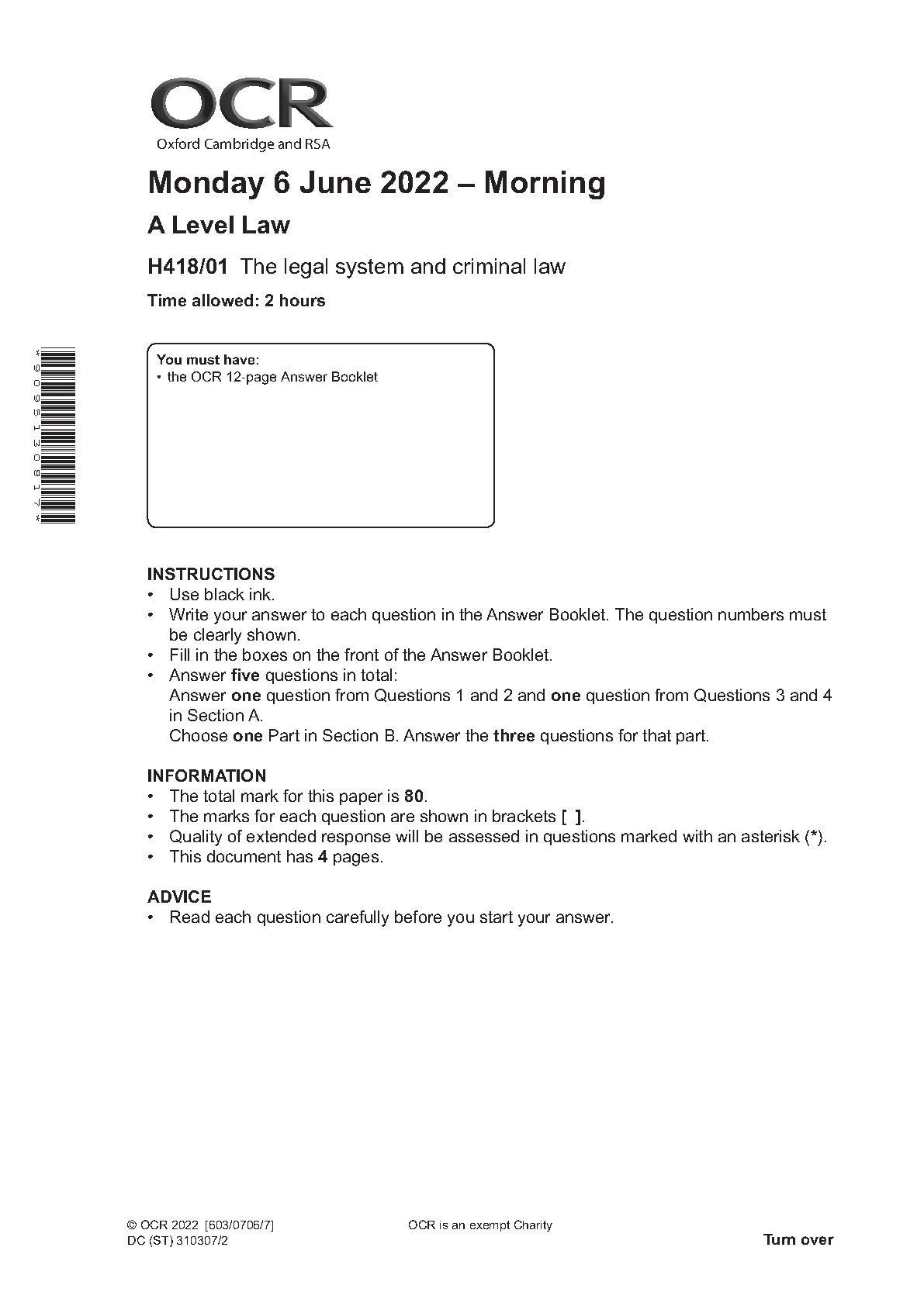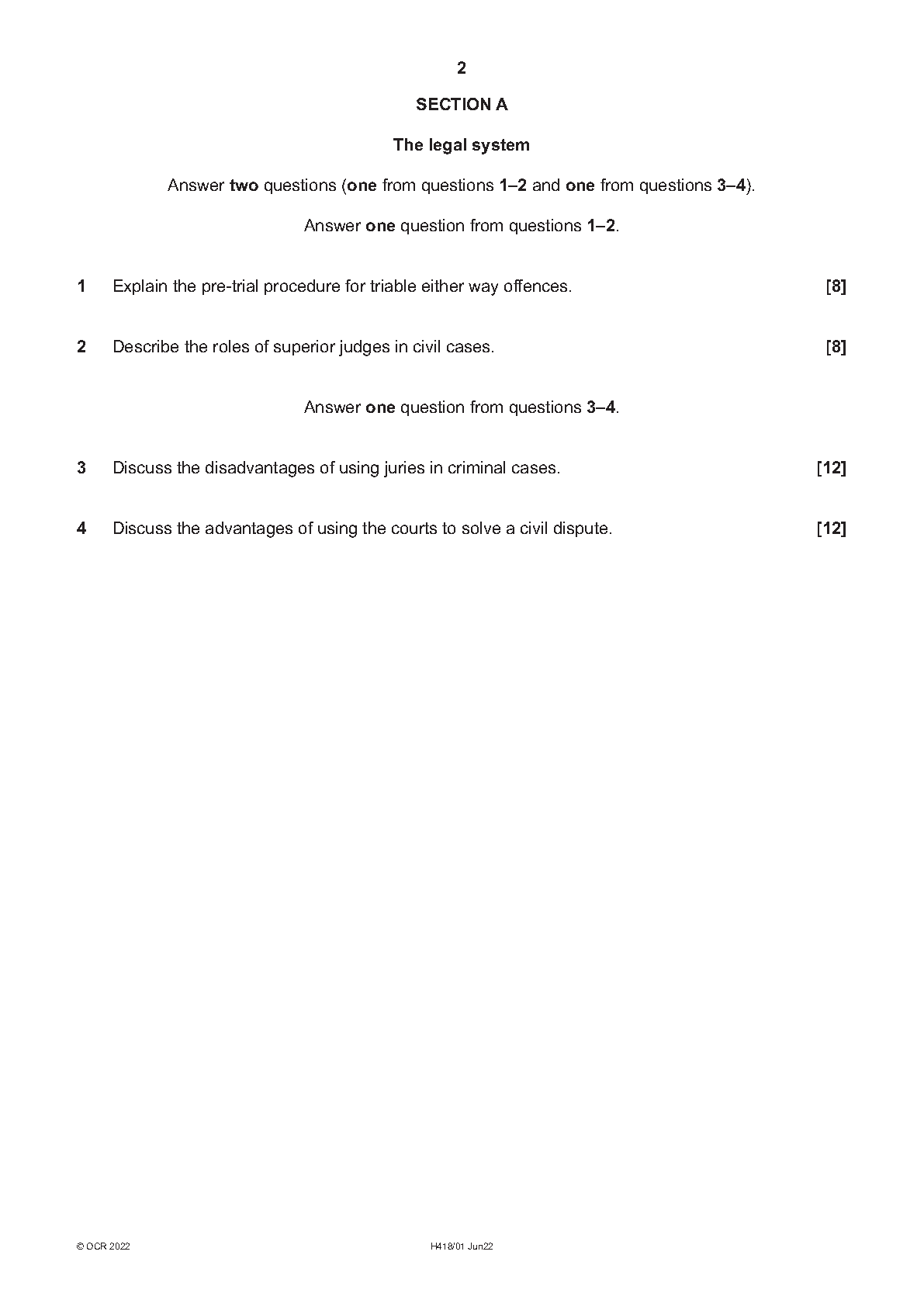 OCR A Level Law H418/01: The Legal System and Criminal Law Exam Paper (June 2022)