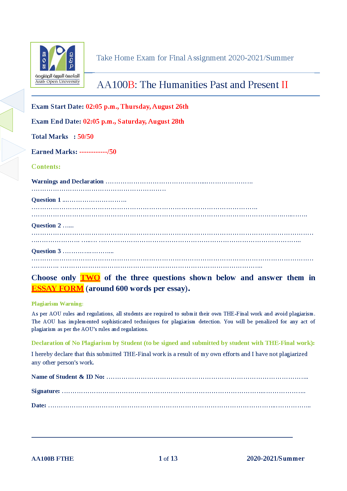 This resource contains the exam questions and instructions for the AA100B: The Humanities Past and Present II course at the Arab Open University for the Summer 2020-2021 session. The exam requires students to answer two out of three essay questions, each around 600 words in length. This is a valuable study tool for students preparing for similar exams.