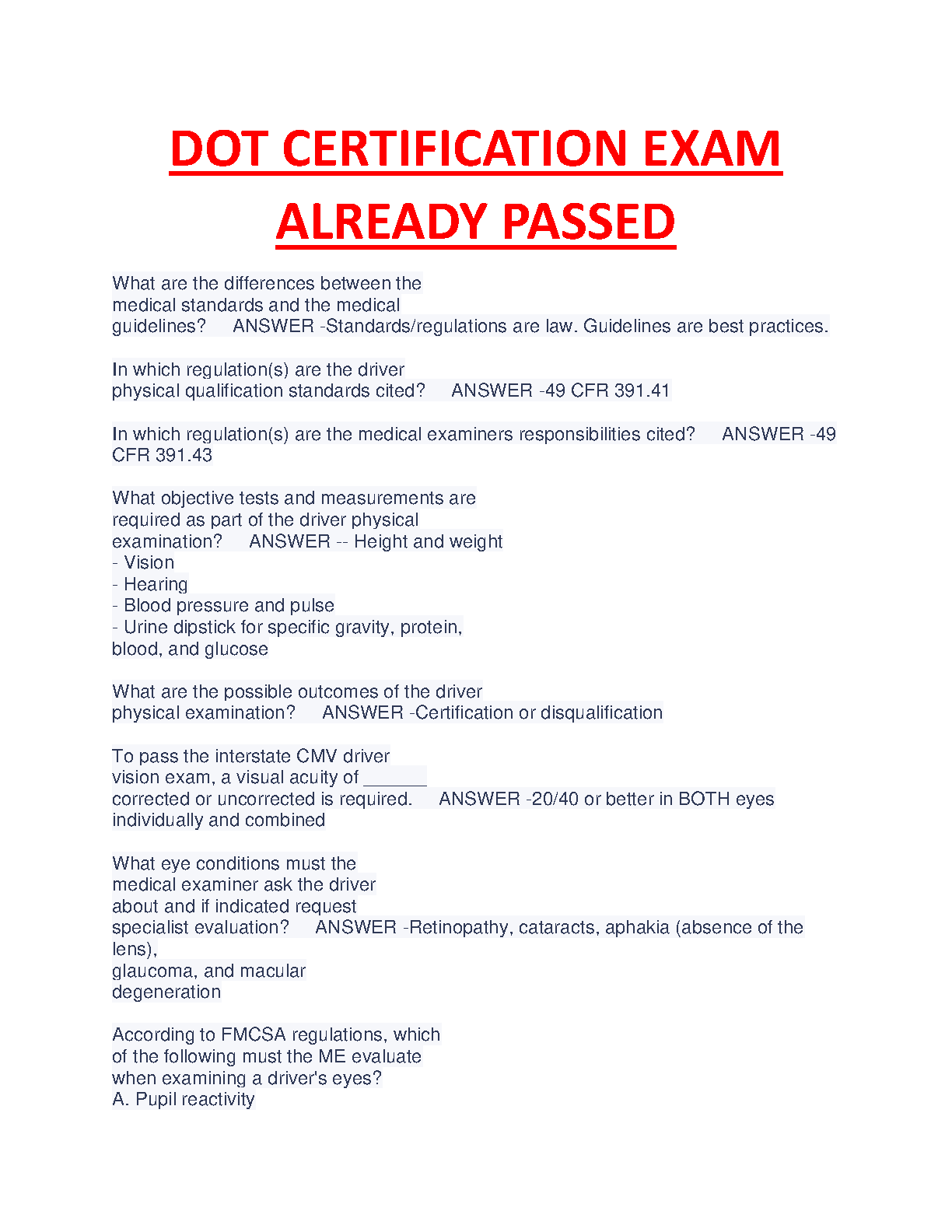 Ace your DOT Certification Exam on the first try with this comprehensive study guide, designed to help you avoid resits. This resource covers key areas like medical standards, regulations, required physical tests, and potential exam outcomes. Get exam-ready with our detailed explanations and practice questions.