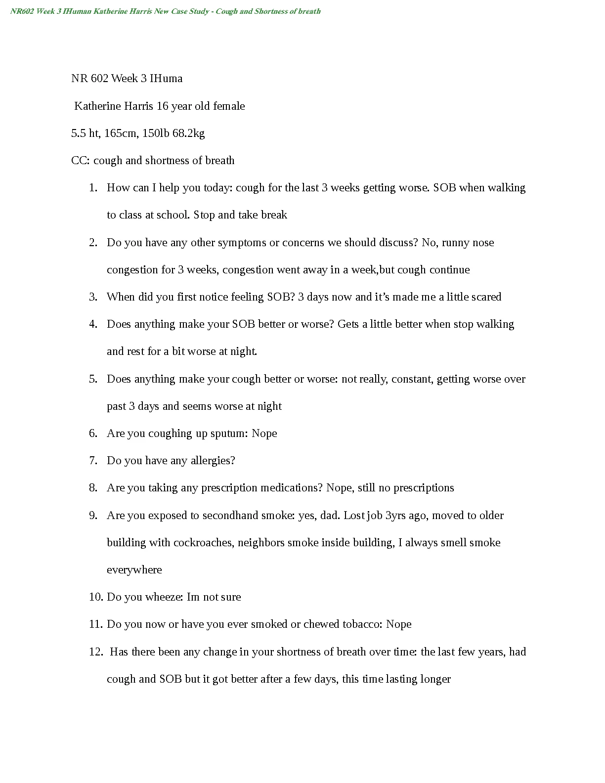 NR 602 Week 3 IHuman Case Study: Katherine Harris - Cough and Shortness of Breath (2024/2025 Edition)