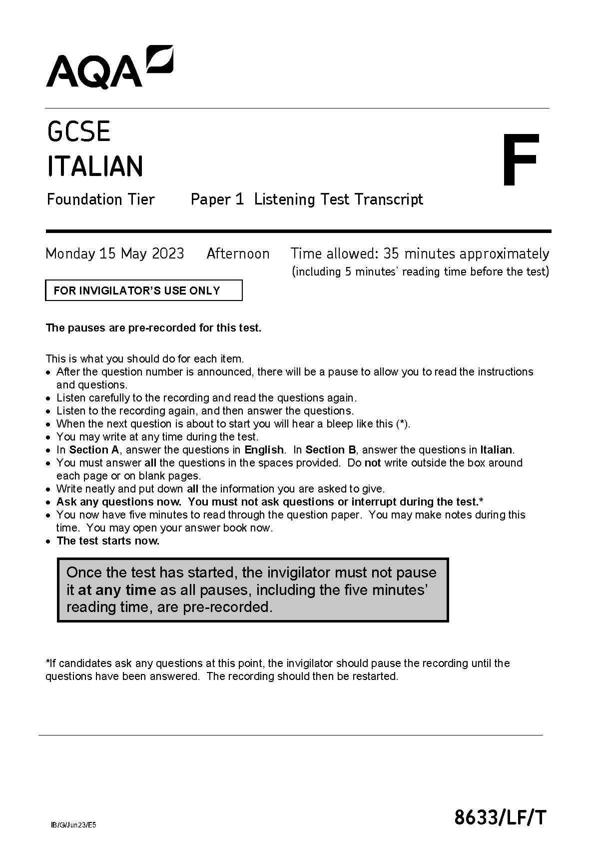 AQA GCSE ITALIAN PAPER 1 MAY 2023 QUESTION PAPER (8633/LF/T: Foundation Tier - Listening Test Transcript)