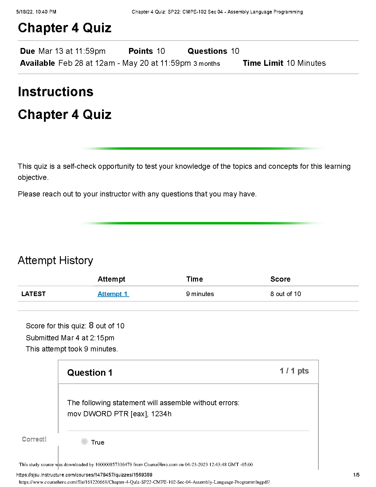 Chapter 4 Quiz: SP22: CMPE-102 Sec 04 - Assembly Language Programming LATEST UPDATE 2023