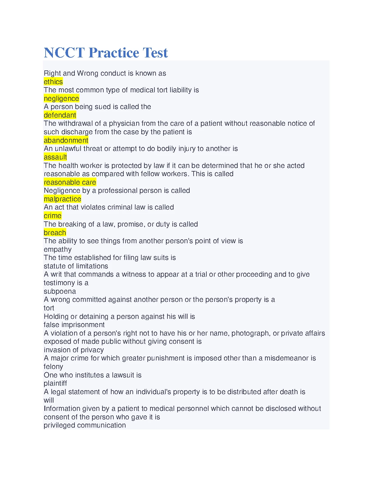 NCCT Practice Test Questions with Correct Answers Graded A+ FOR 2023/2024. DOWNLOAD on www.hackedexams.com INSTANTLY.