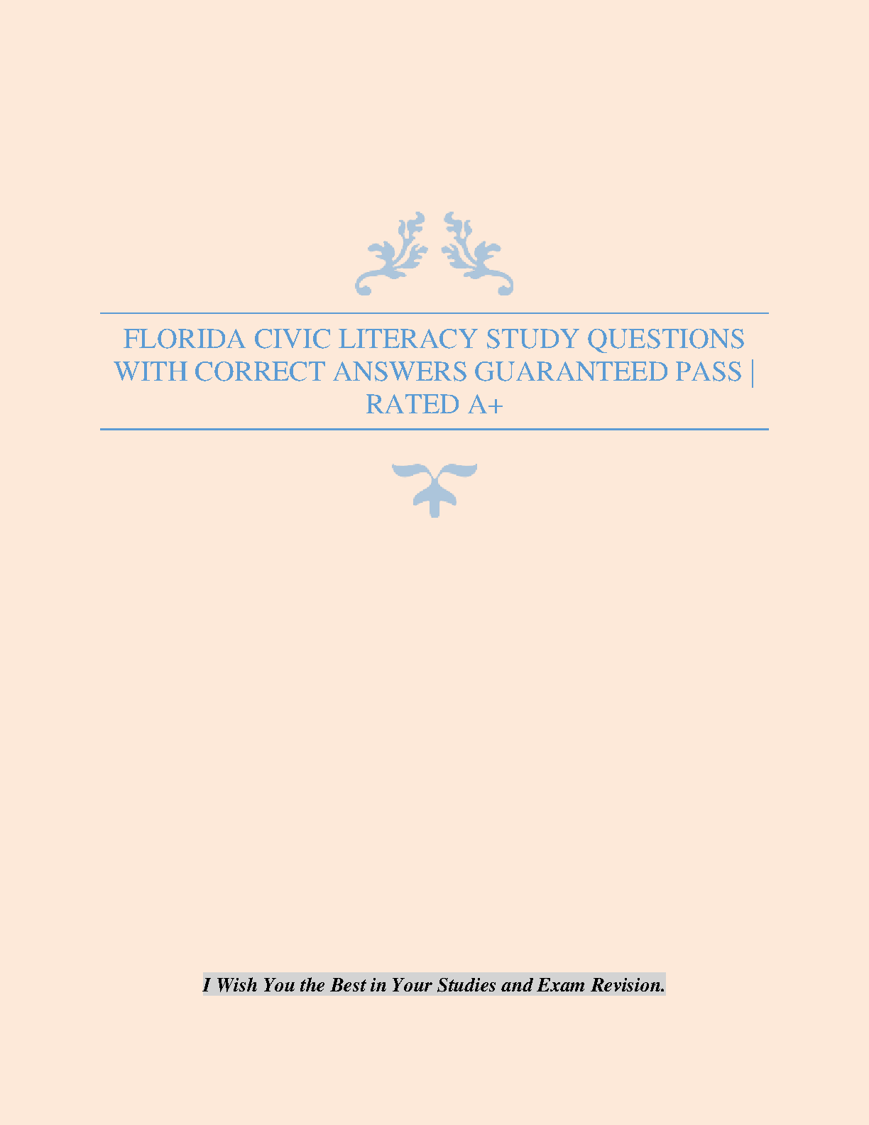Prepare for the Florida Civic Literacy Exam (FCLE) with confidence using this expertly curated test bank, specifically designed for the 2025/2026 academic year. This essential study resource provides a robust collection of study questions complete with verified correct answers, ensuring you master all necessary concepts. Aim for a guaranteed A+ score and pass your FCLE on the first attempt, effectively avoiding costly resits and securing your academic success.