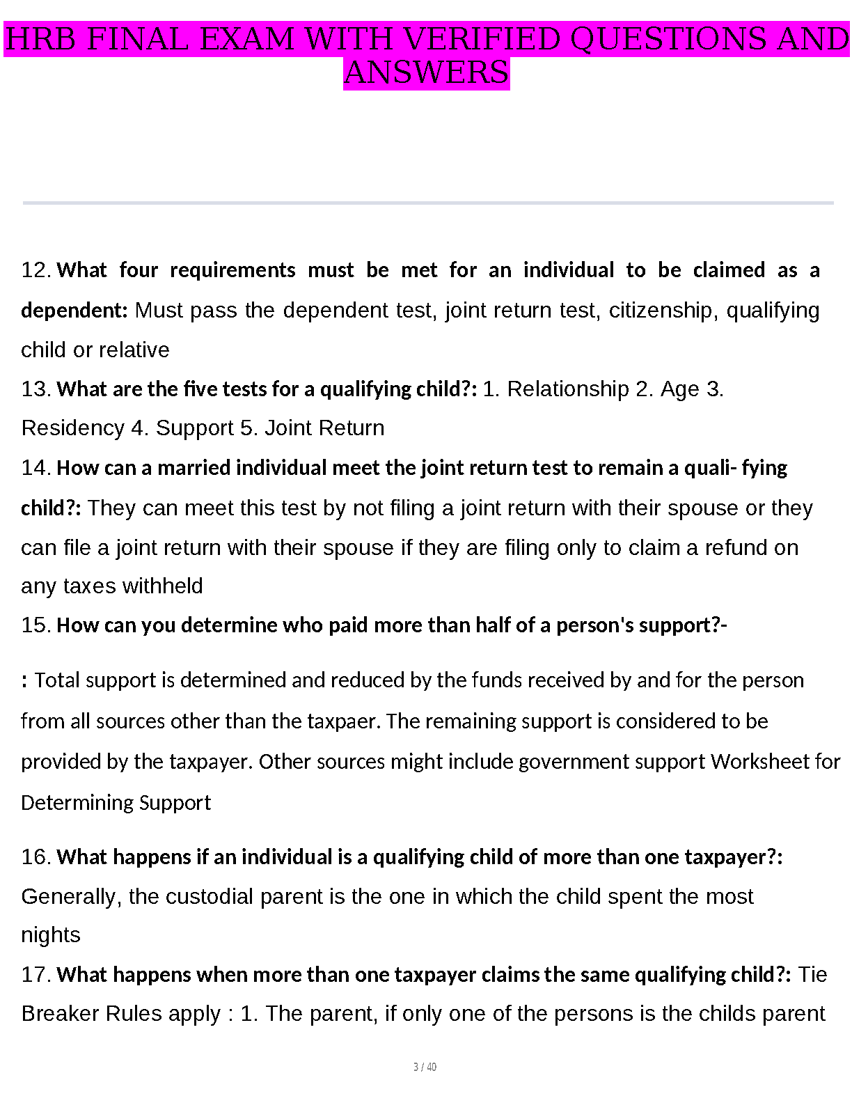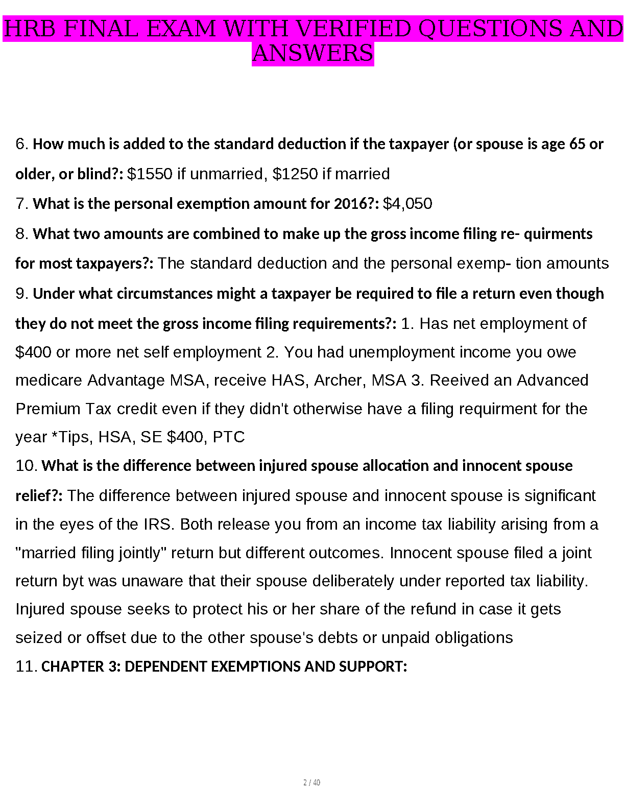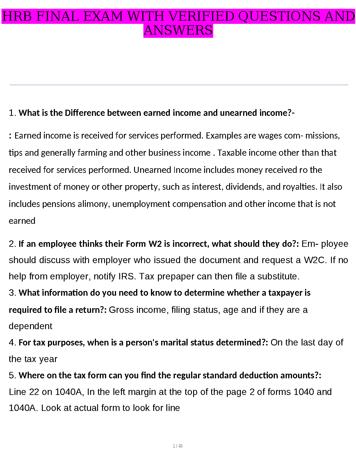 Ace your H&R Block Tax Preparation Final Exam with this comprehensive test bank, featuring verified questions and detailed answers covering essential tax concepts such as earned vs. unearned income, W-2 corrections, filing requirements, marital status for tax purposes, and standard deduction calculations (Form 1040A). Designed specifically for the 2025-2026 academic year, this resource is your ultimate tool to master complex tax regulations and pass your H&R Block certification exam on the very first attempt. Avoid costly resits and gain the confidence you need to succeed in your tax preparation career with these expertly curated materials.